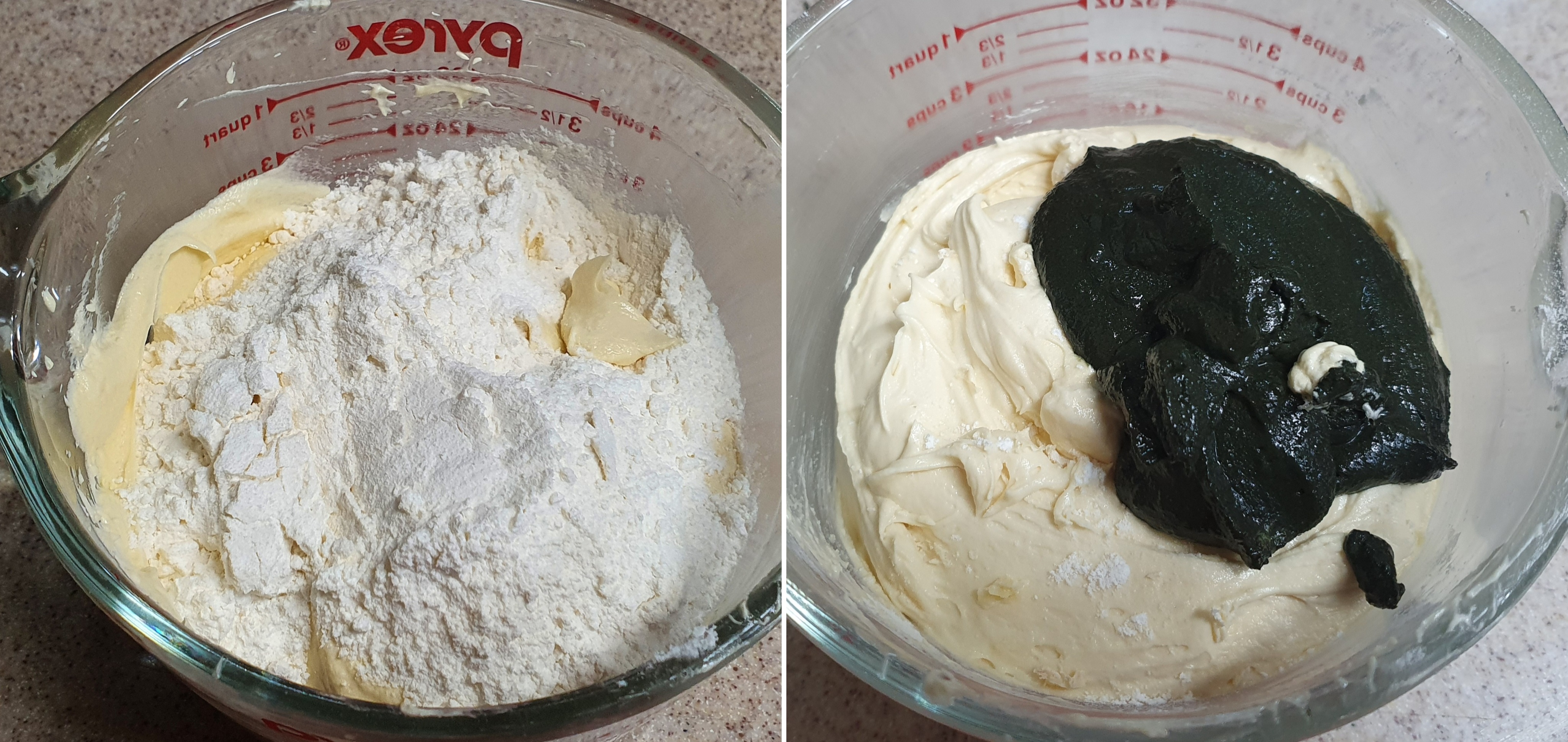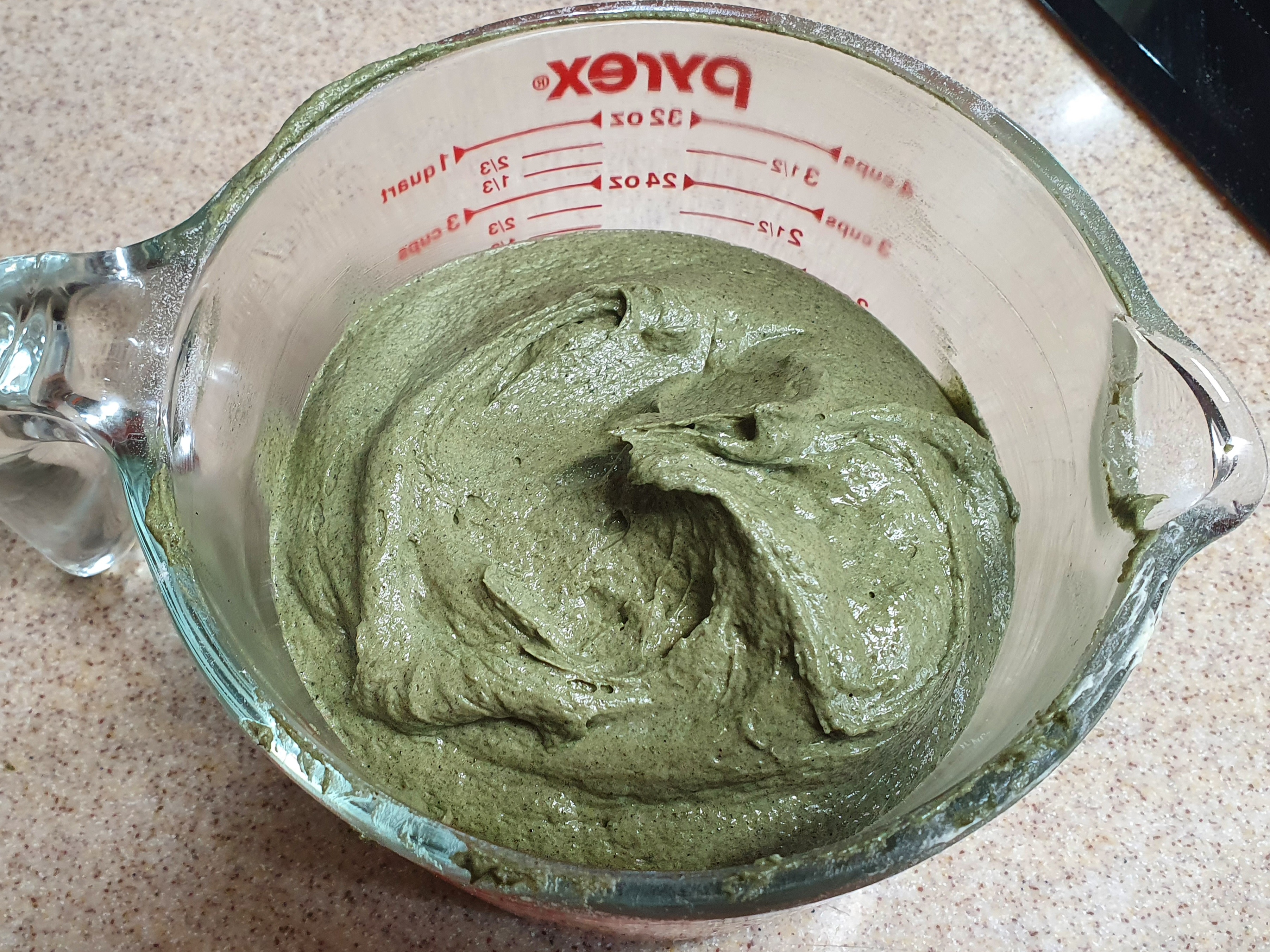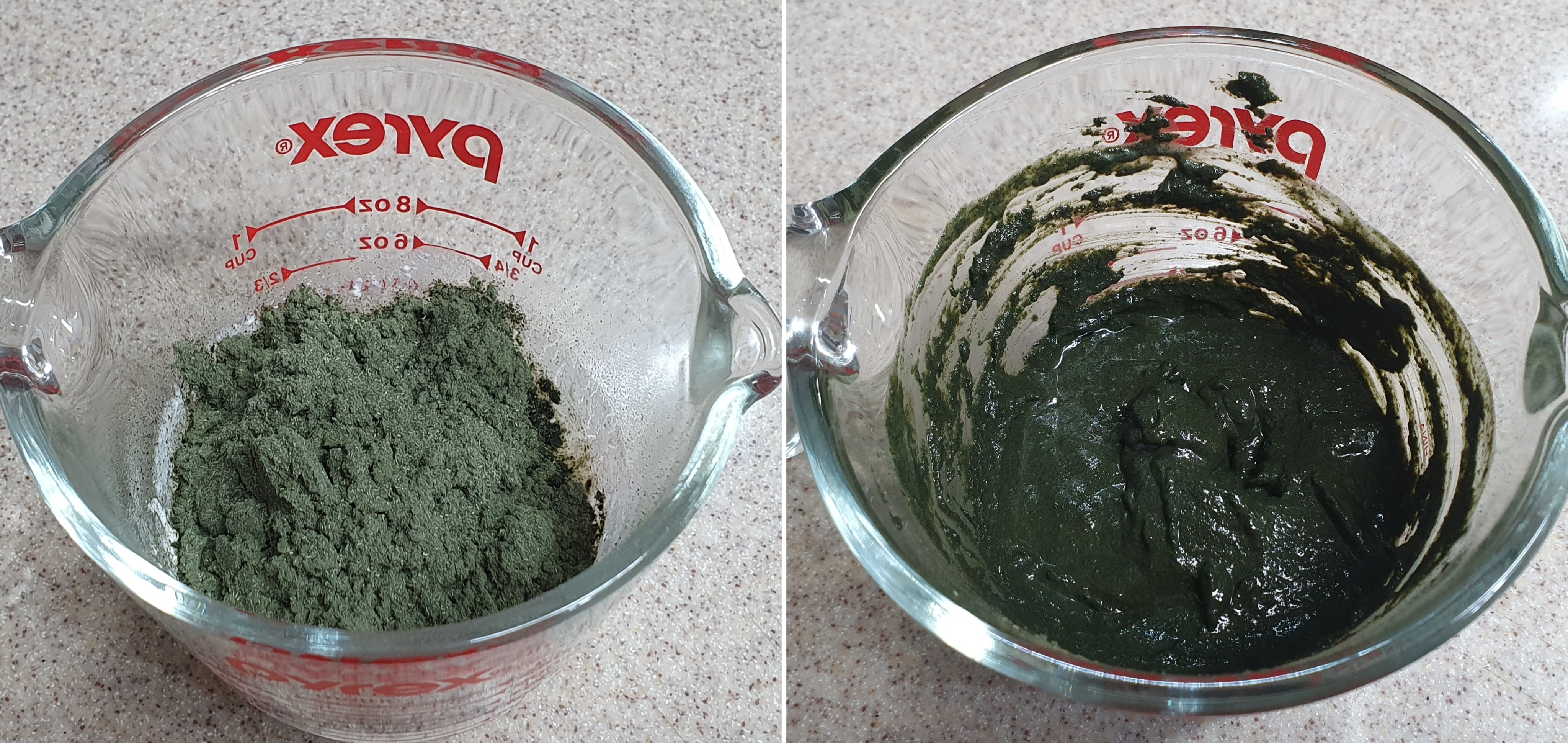 쑥가루를 밀가루와 같이 더할 수도 있는데, 쑥가루는 섬유가 강한 편이고, 수분을 많이 잡아먹어서 미리 개어두는 것이 낫다. 요거트 90g을 전자레인지에 30초 정도 돌려서 따끈하게 만들고, 쑥가루 20g을 넣어 잘 섞어둔다. 쑥가루가 골고루 섞였을 때 고추장 정도로 되직한 농도가 되면 농도가 잘 맞는다. 요거트가 조금 따끈하지만 반죽하는동안 식어서 온도가 맞는다.