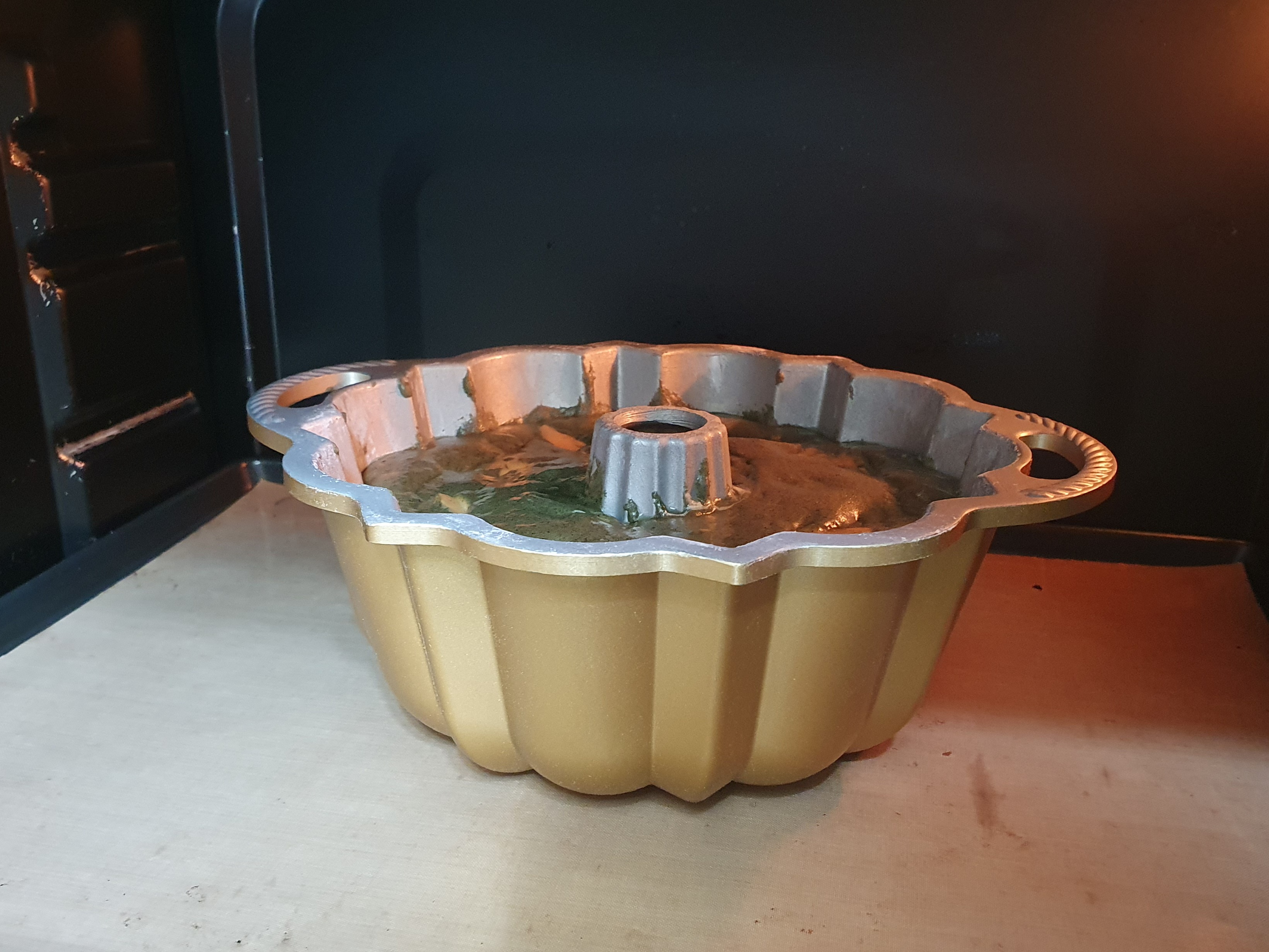 170도로 예열한 오븐에서 35-38분 굽는다. 오븐 랙 4개 중 3번째에 망을 걸고, 그 위에 쿠키팬을 올리고 번트팬을 올려 구웠다. 크림치즈가 차가운 상태라 일반 파운드케이크보다 3~5분 정도 더 구워주어야 한다.
