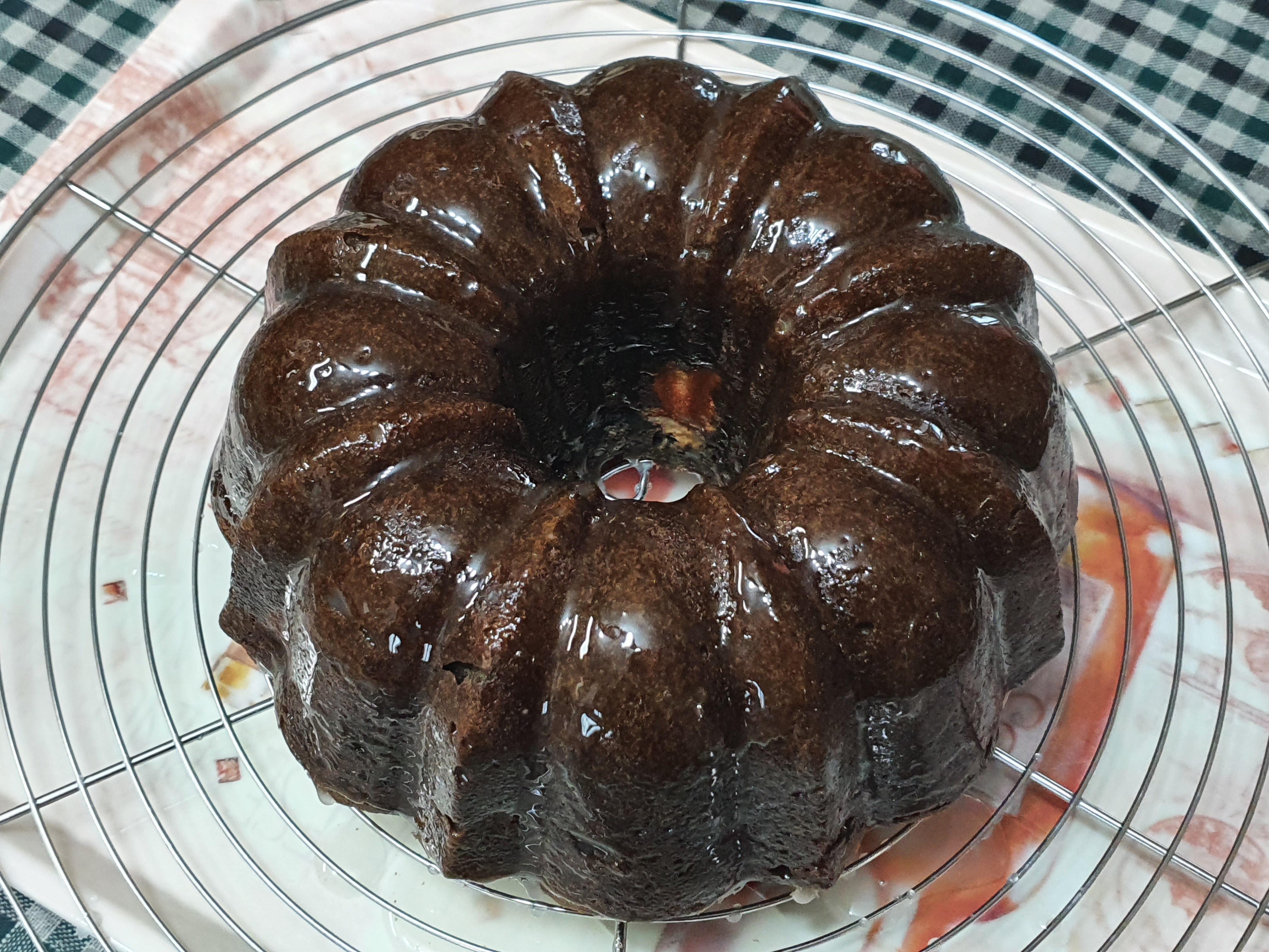35분째에 꼬치테스트를 했더니 반죽이 좀 묻어나오길래 3분 더 굽고 꺼냈다. 온도를 170도로 했더니 겉면이 노릇한데, 160도로 했다면 40분은 구워야 할 것 같다. 꺼내자마자 윗면에 럼을 바르고, 10분간 식힌 후 뒤집는다.
