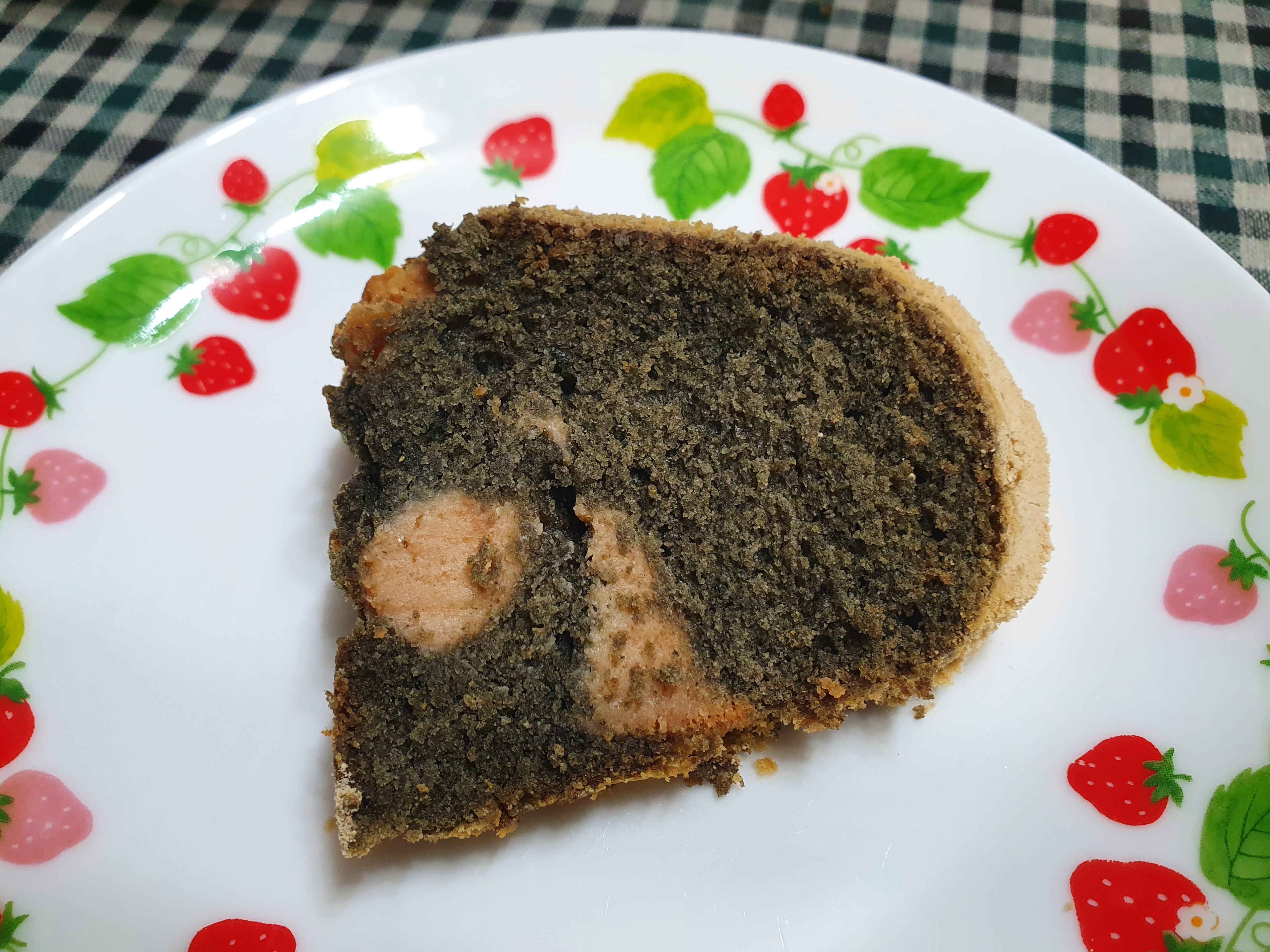 단면은 이렇다. 처음에 쑥파운드 반죽을 많이 넣어서 크림치즈가 약간 아래로 쏠린 감이 있지만, 인절미 크림치즈 자체가 넉넉히 들어간 편이라 진한 쑥인절미 맛이 난다. 겉면에 뿌린 콩가루가 날릴 수도 있어서 조금 조심해서 먹어야하지만, 촉촉하고 쑥 맛이 나는 파운드와 중간중간 들어있는 인절미 크림치즈 덕분에 확실히 쑥인절미 느낌이 난다.