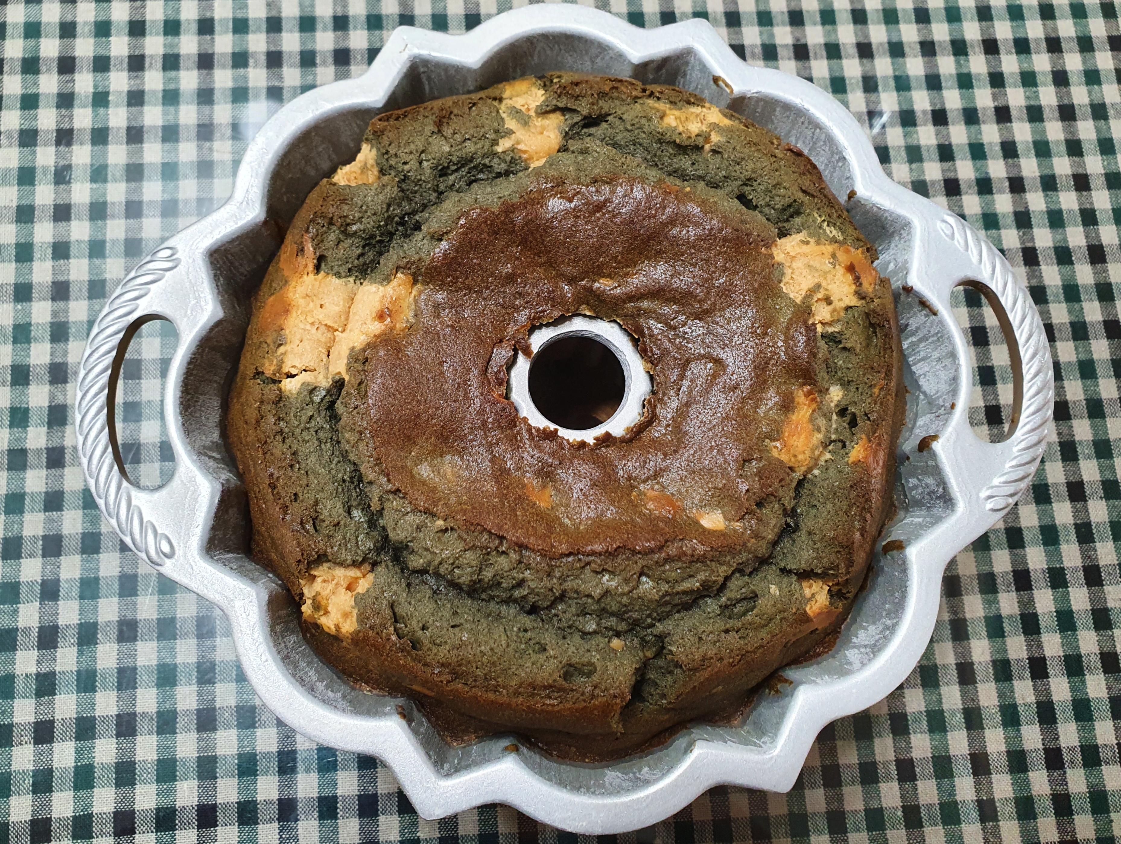 틀이 뜨거워서 10분쯤 식힌 후 뒤집어도 아직 빵은 뜨겁다. 역시 뒤집자마자 럼을 발라준다. 틀에 닿는 부분은 갈색으로 구워지다보니 쑥 파운드 같은 느낌이 안 나고, 칙칙한 색이라 콩가루를 씌우는 게 좋을 것 같다. 럼을 바르자마자 빵이 뜨거울 때 콩가루를 바로 뿌리면 잘 붙어있다.