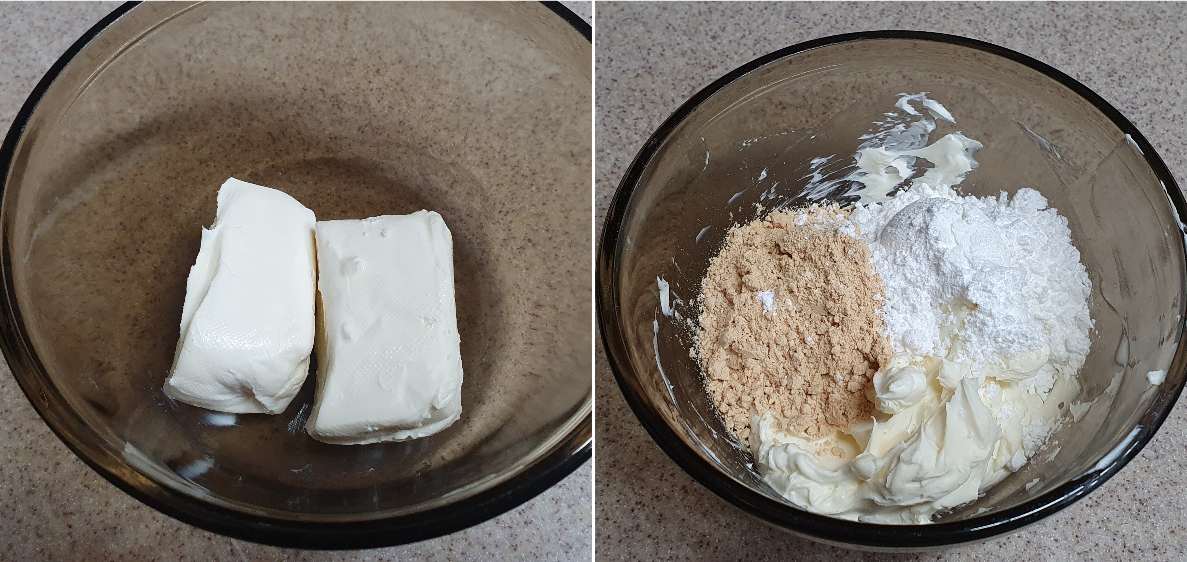 가장 먼저 인절미 맛 크림치즈를 만들어둔다. 남은 크림치즈가 120g 있어서 전부 사용했는데, 80~100g 정도가 적당할 것 같다. 이 경우 크림치즈 100g에 설탕, 콩가루 30g, 슈가파우더 30g정도가 적당할 것 같다. 크림치즈는 실온에서 냉이 빠지도록 두었다가, 주걱으로 덩어리가 없도록 완전히 풀어 준 다음 슈가파우더와 콩가루를 넣고 섞는다. 거품기를 사용하지 말고 주걱으로 눌러가며 잘 섞는다.