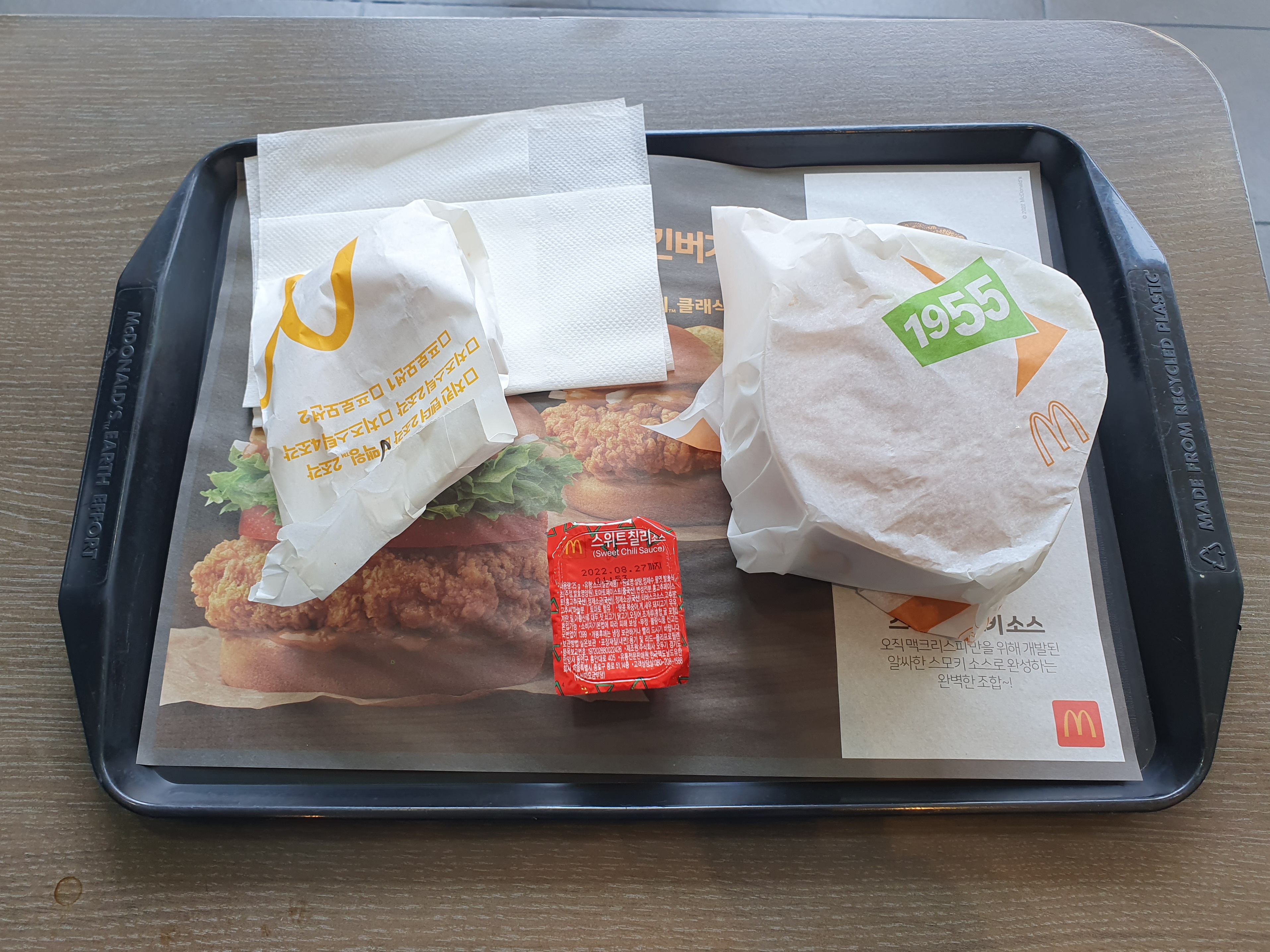 맥모닝이 끝난 지 얼마 안 된 시간인데다, 맥윙 주문한 사람이 없어서인지 꽤 오래 걸려 나왔다. 종이 봉투에 담긴 맥윙 2조각과 스윗칠리 소스, 1955 버거 단품. 그래도 오래걸려 나와서 그런지 상태는 아주 뜨끈뜨끈하다.