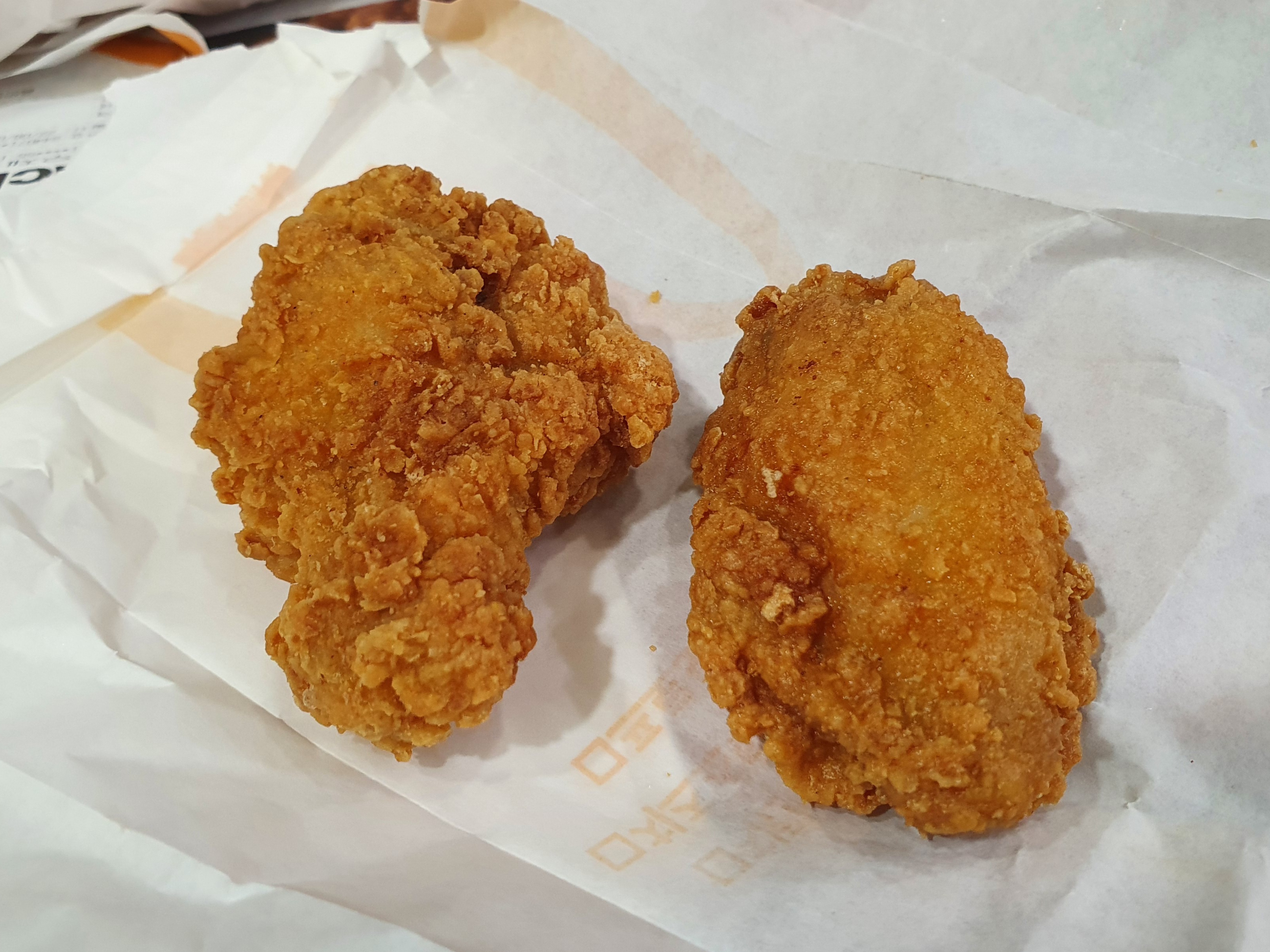 일단은 맥윙부터. 봉지를 열어보면 날개 부분과 닭봉 부분이 한 조각씩 들어있다. 후추 향이 강한 편이고, 겉 튀김옷이 단단한 미국 스타일 치킨. 나는 튀김옷이 단단한 치킨을 좋아해서 내 취향에 잘 맞는다. 그래도 두 조각에 2,900원은 조금 비싸지 않나싶다. KFC가 한 조각에 2,700원인데, 거기 1조각이 맥윙 3조각 정도의 분량일 듯.