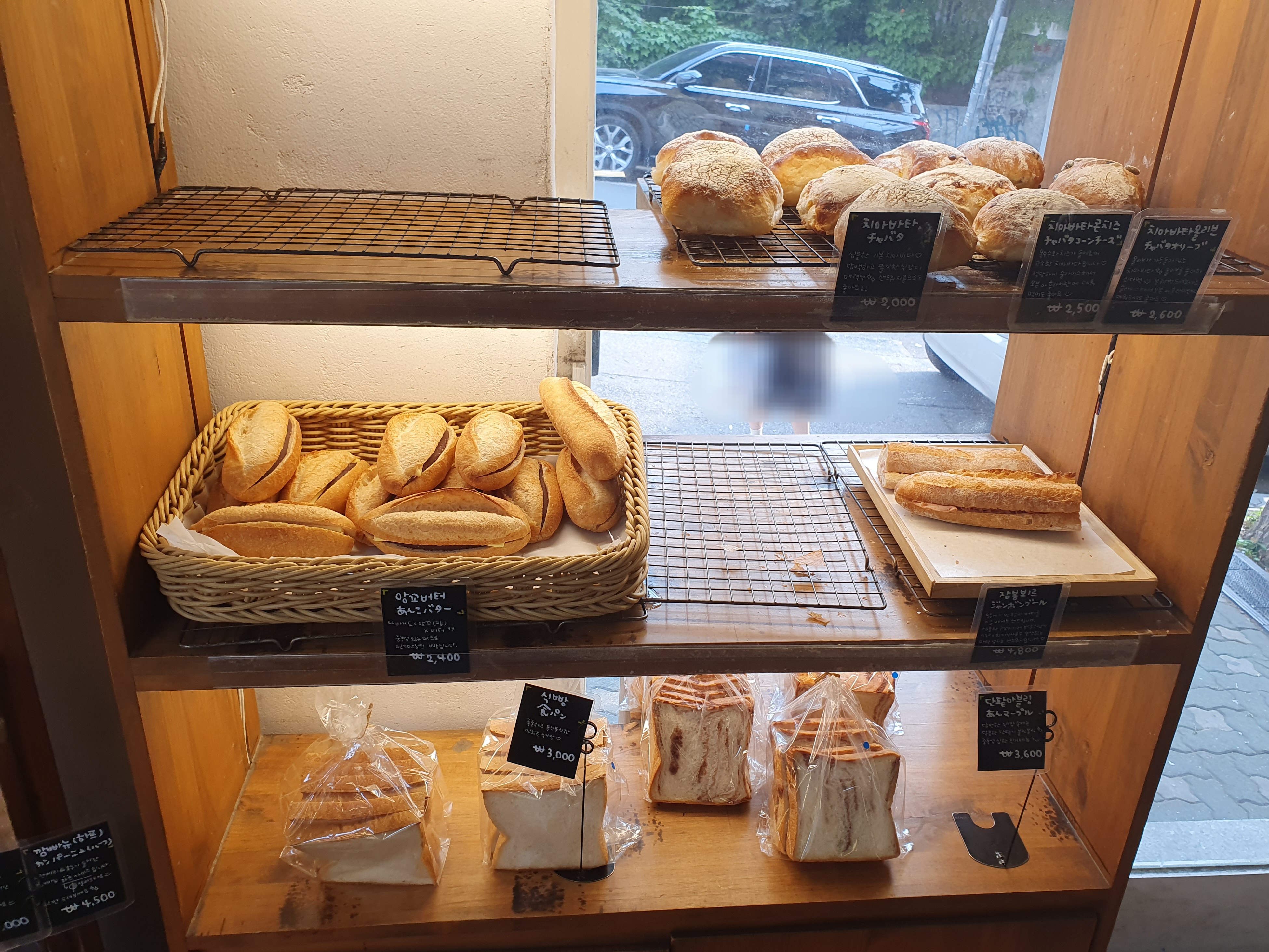 치아바타와 앙버터, 잠봉뵈르, 식빵. 식빵은 도톰하게 자른 것과 얇게 자른 것 두 가지가 있다. 여기 식빵을 노릇하게 구워서 버터 발라 먹으면 정말 맛있는데, 오늘은 잠봉뵈르를 사러 온 것이니 패스. 다른 곳보다 약간 얄쌍한 바게트를 반으로 자르고, 다시 배를 갈라 잠봉과 버터를 넣었다. 바게트가 약간 얄쌍한 편이라 다른 빵집의 잠봉뵈르보다는 양이 작을 수는 있는데, 가격이 저렴해서 가성비가 좋다.
