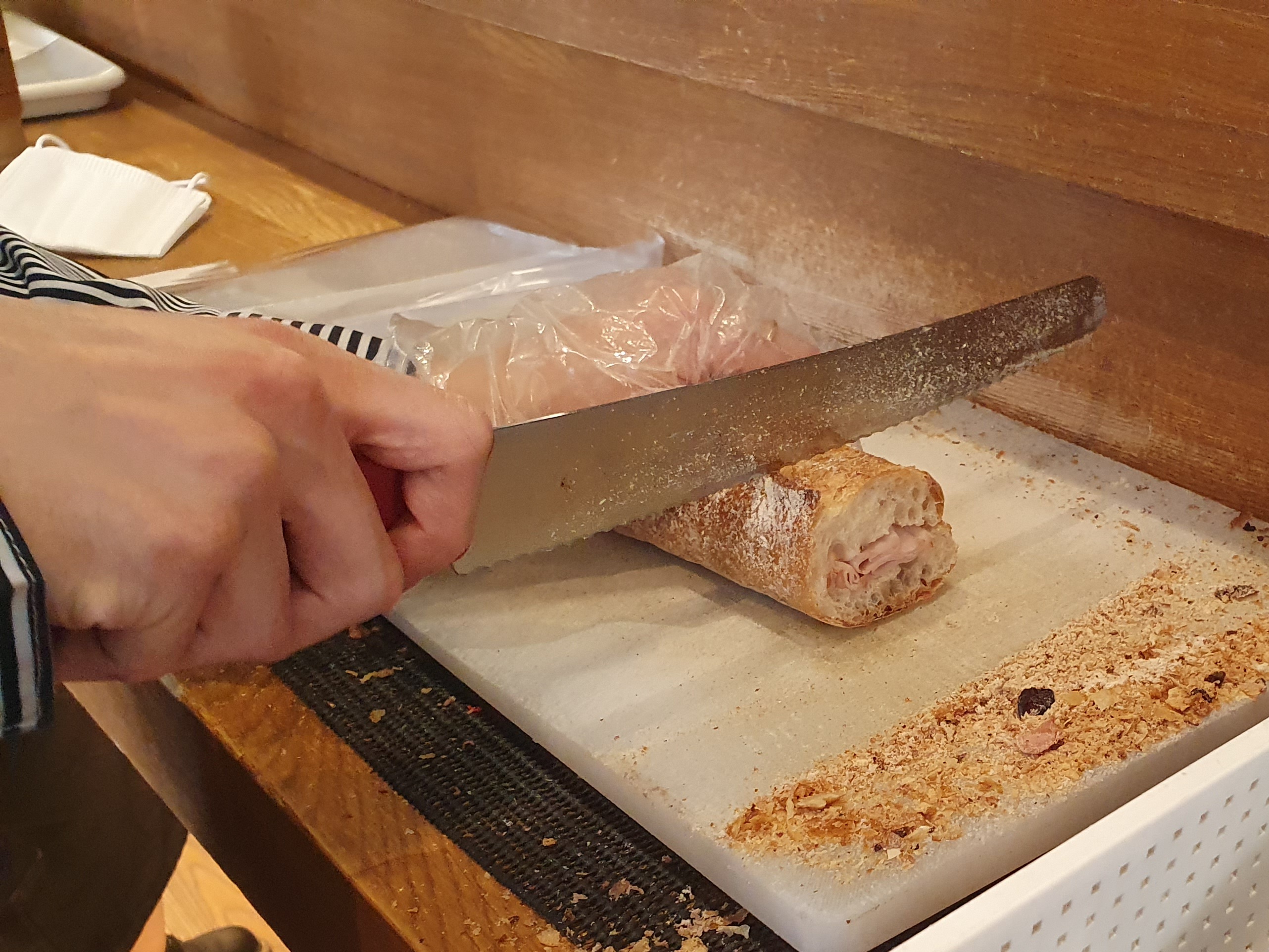 잠봉뵈르는 컷팅 여부를 물어보는데, 바게트 빵이다보니 아예 컷팅해서 먹는 게 편하다. 빵칼로 적당한 크기로 잘라서 비닐에 포장해준다.