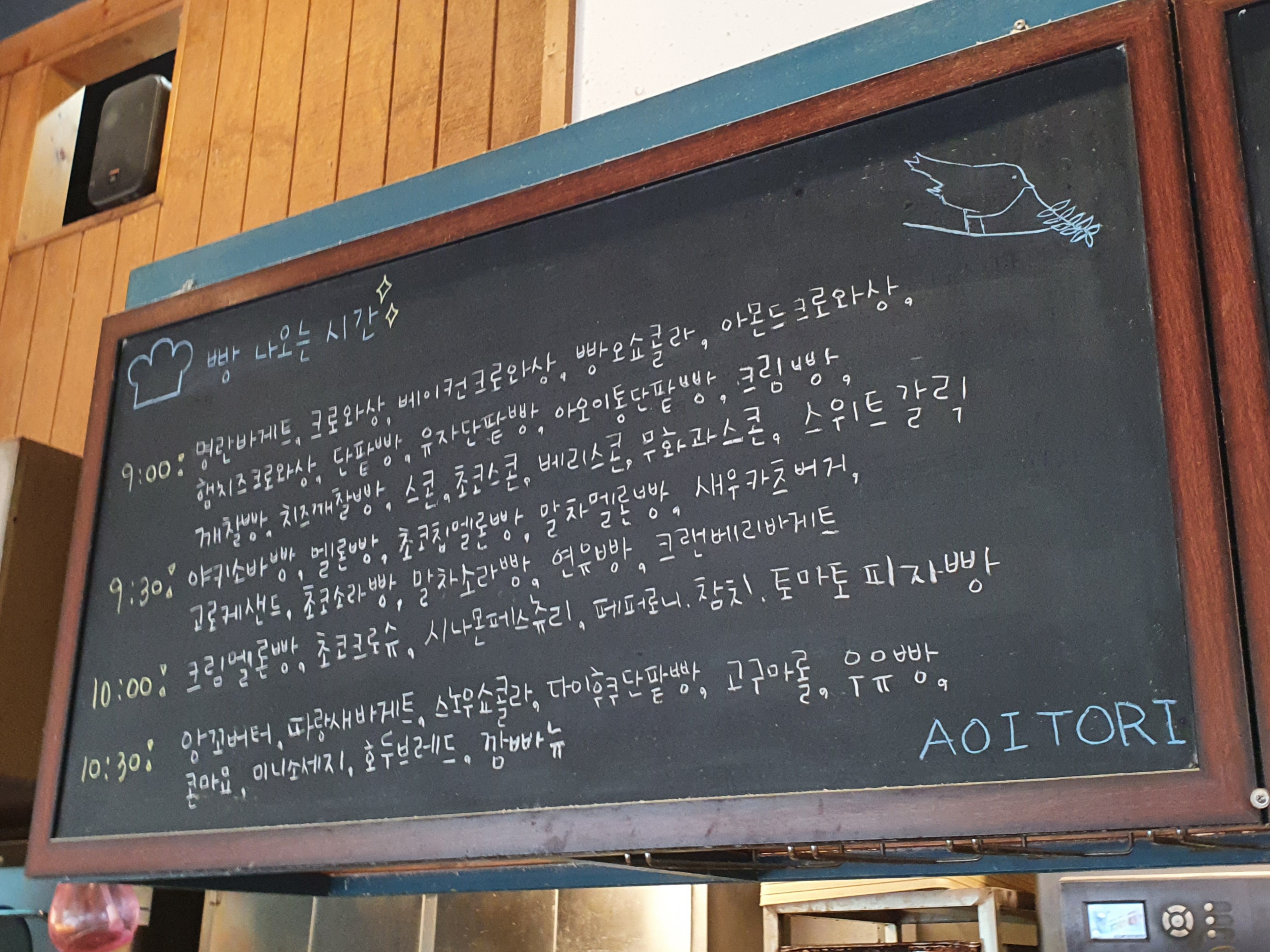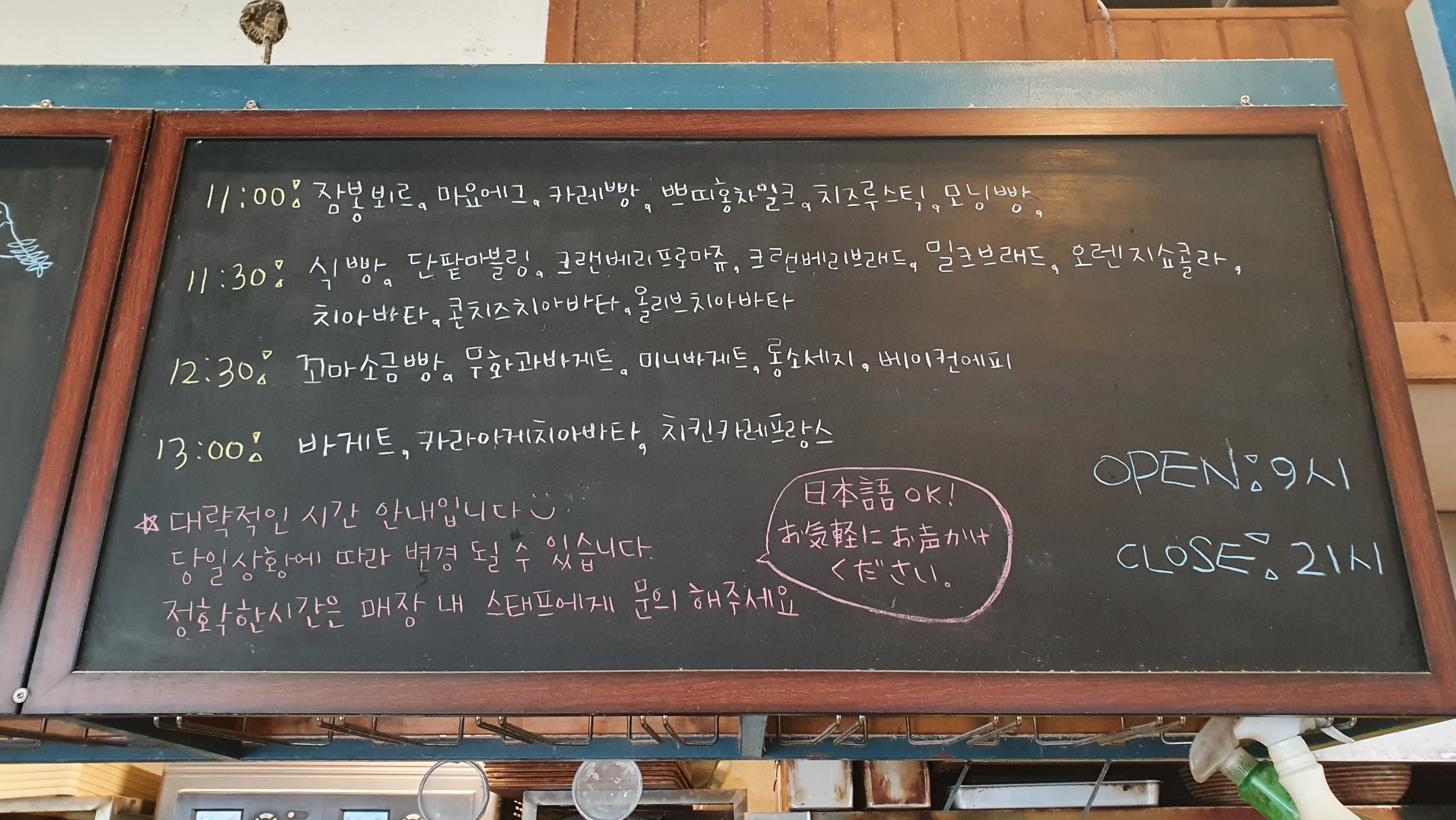 빵 나오는 시간. 대략적인 메뉴도 알 수 있다. 대충 점심 먹고 카페 갔다가 2~3시쯤 왔을 때가 가장 빵이 많은 시간인 것 같다.