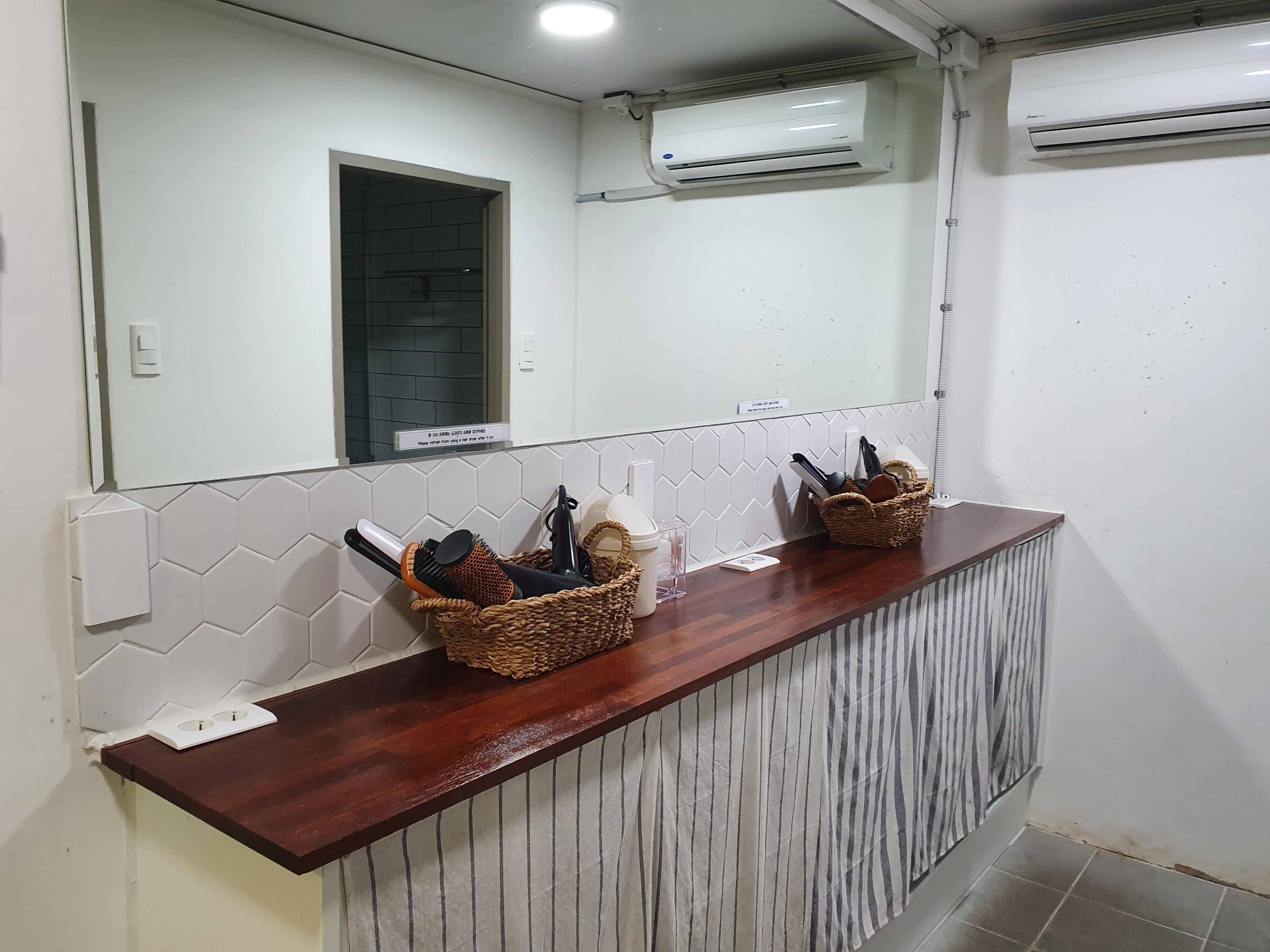 오른쪽으로 들어오면 샤워실이 있다. 한쪽에는 큰 거울과 드라이기, 각종 빗, 화장솜과 면봉이 준비되어있고, 반대편은 샤워부스가 든 칸이 있다. 6칸인가 7칸이었던 것 같은데, 각각 문이 달려있고 그 안에 수건 거치대와 샤워부스가 나눠져있어서 사용하기 편하다. 문은 샤워실 문을 잠그고 이용하면 되는데 밖에서 들여다보이지 않아서 게스트하우스 샤워실로 이보다 더 나은 게 없을 정도다.