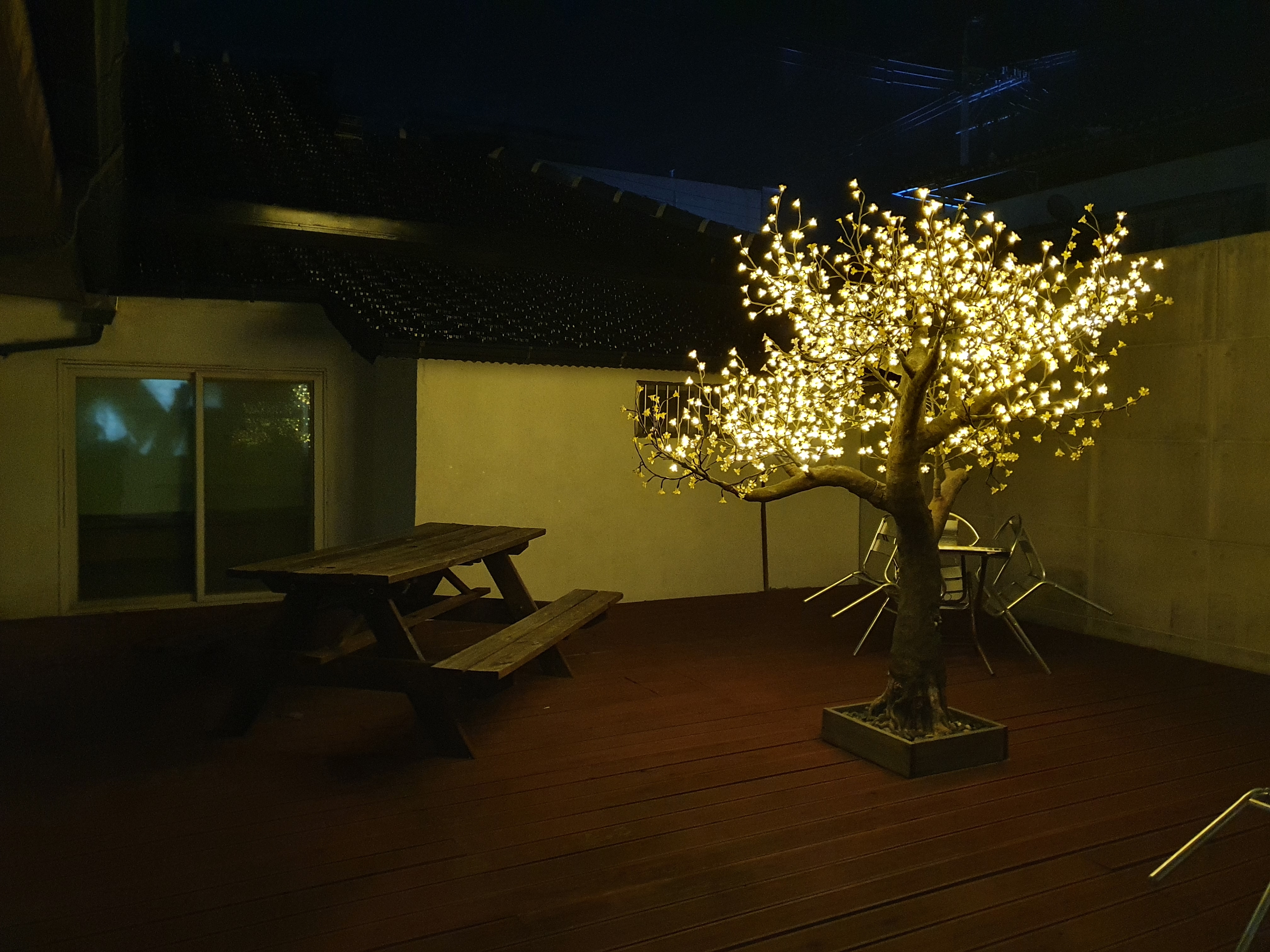 파우더룸을 나와 조금 지나면 중정으로 나가는 폴딩도어가 있다. 이날은 이미 9시가 다 되어갈 때라 해가 다 지고 나무에 조명이 들어왔는데, 해가 지기 전이라면 벤치에 앉아서 커피 마시기도 좋을 것 같다. 2층에서는 중정이 내려다보인다고 하던데, 직접 중정에 나오는 게 뷰는 더 좋을 것 같다.