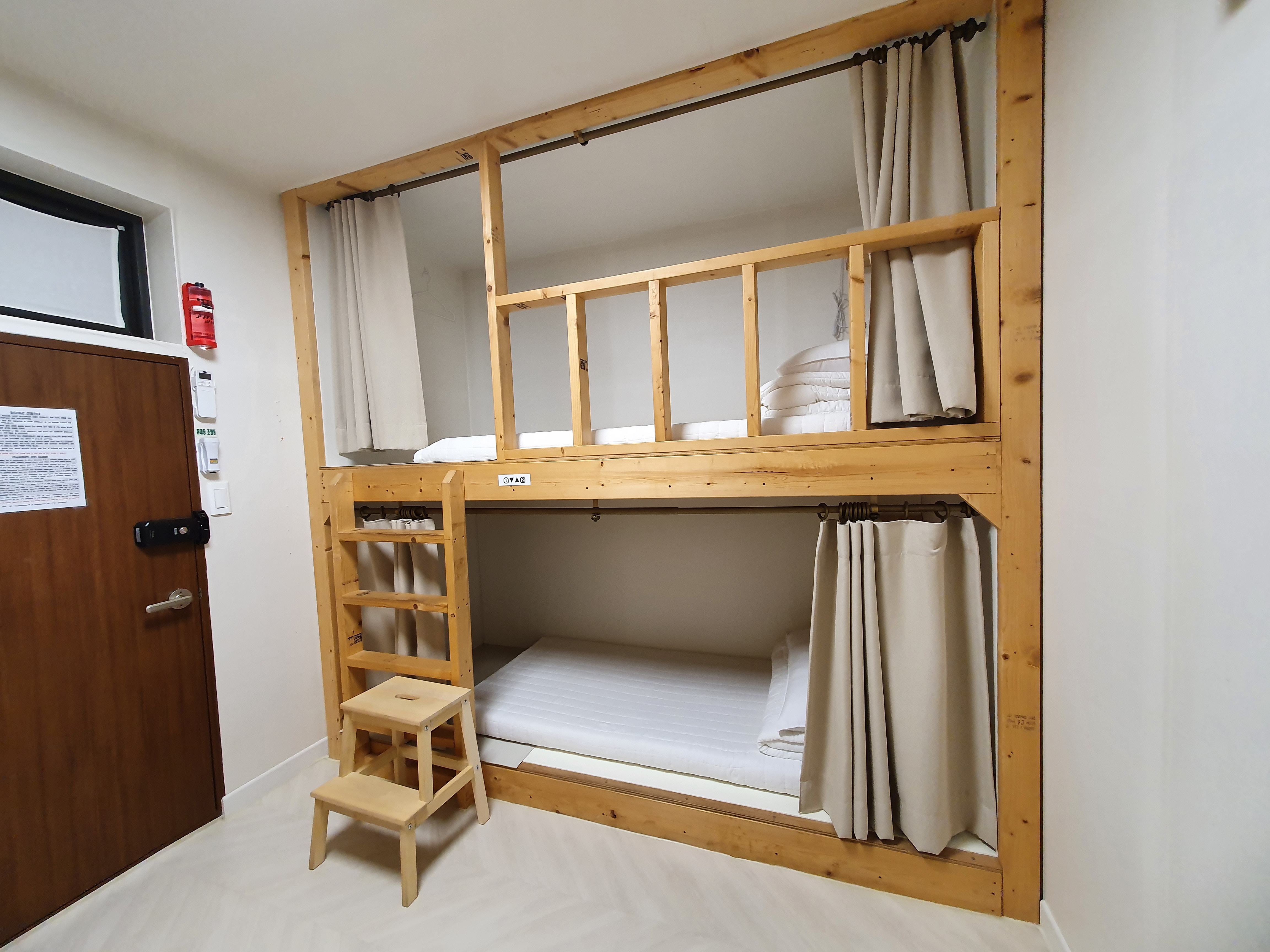중정을 지나 복도를 쭉 따라가면 4인실 도미토리 객실이 나온다. 방마다 도어락이 달려있는데, 체크인하면서 받은 카드키로 열면 된다. 문에 이용안내가 붙어있고, 양 옆으로 붙박이 2층침대가 2개 있다. 이날은 평일이어서인지 이용객이 나까지 2명이라 각각 베드 1층을 사용했다.