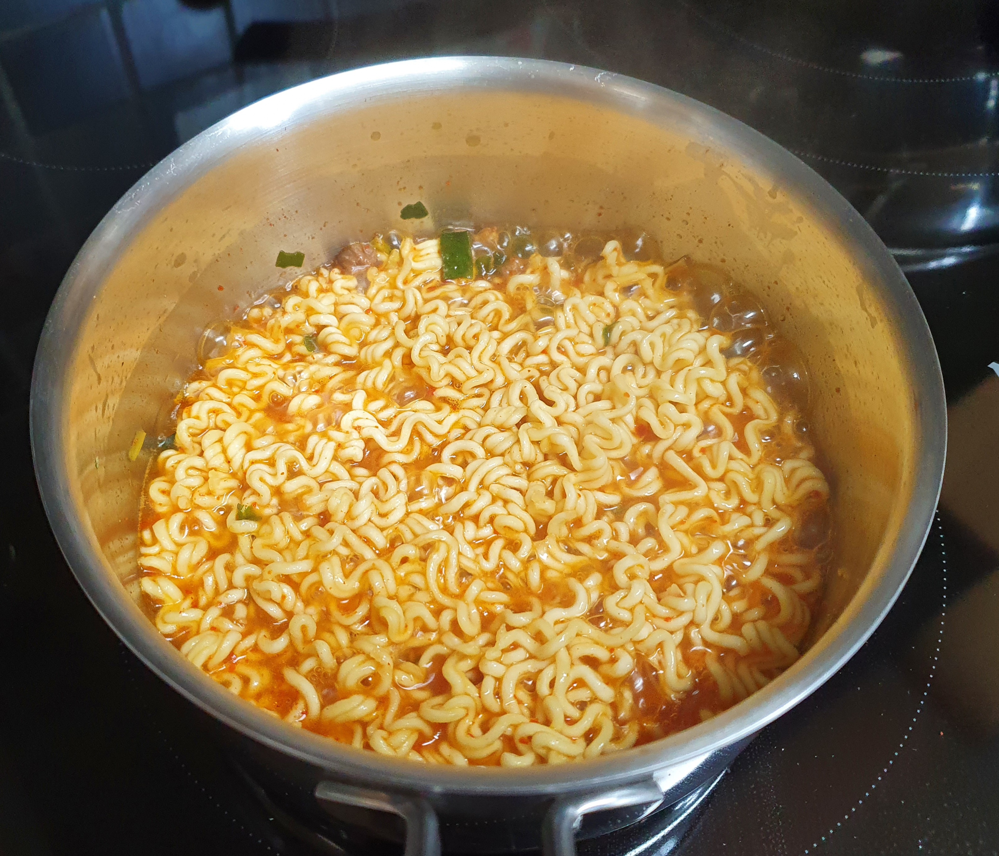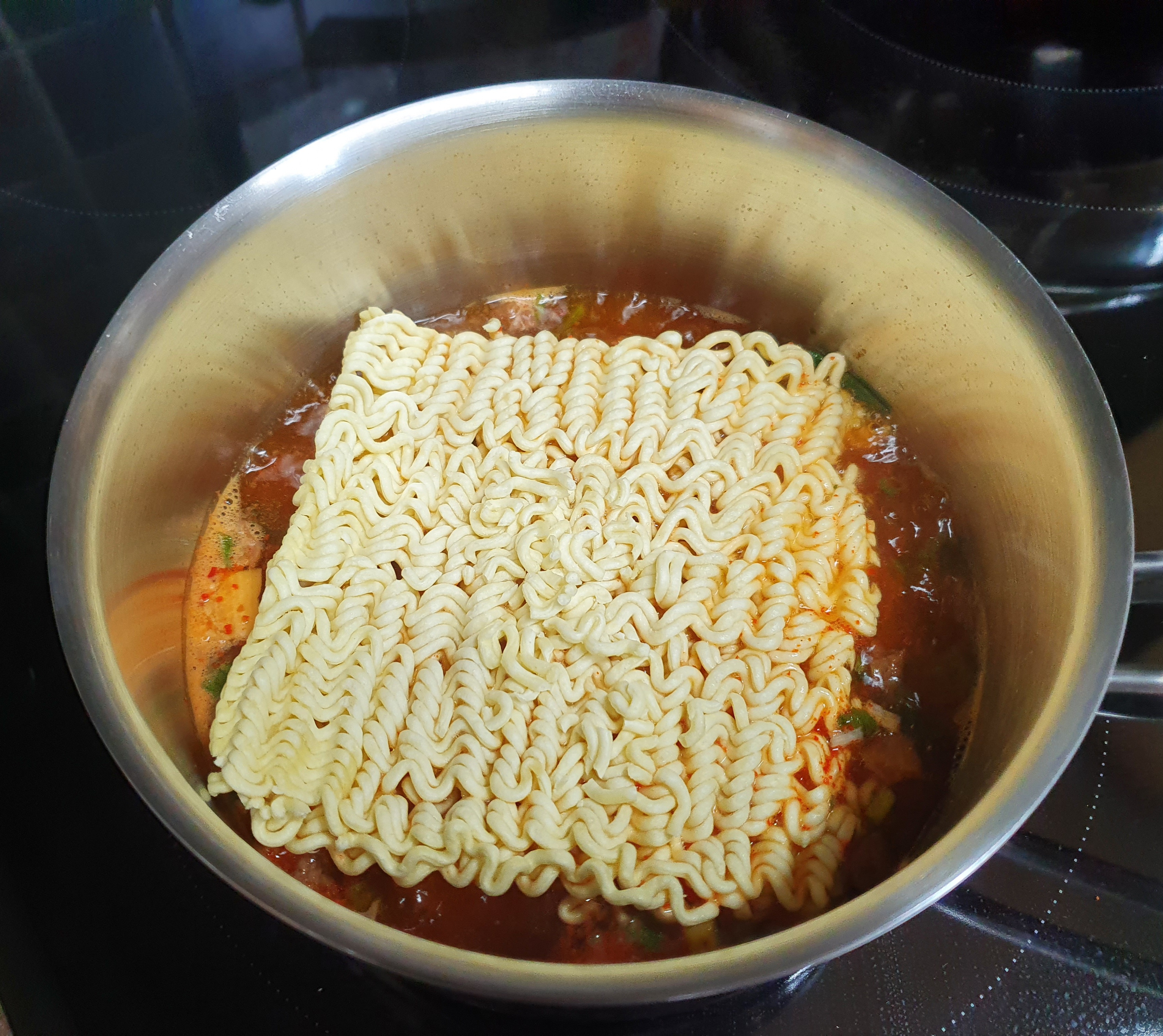 면을 넣고 봉지에 표시된 시간보다 1분 30초정도 짧게 끓인다. 물을 반만 부어서 처음에는 이렇게 면의 반쪽만 잠기는데, 젓가락으로 눌러가면서 익히다보면 면에 국물이 배어들어서 다 잠기게 된다. 중간에 한번 뒤집어주거나 면이 서로 떨어지게 잘 풀어준다. 불은 너무 강하지 않고 보글보글 끓을 정도로, 뚜껑을 닫지 않고 끓인다.