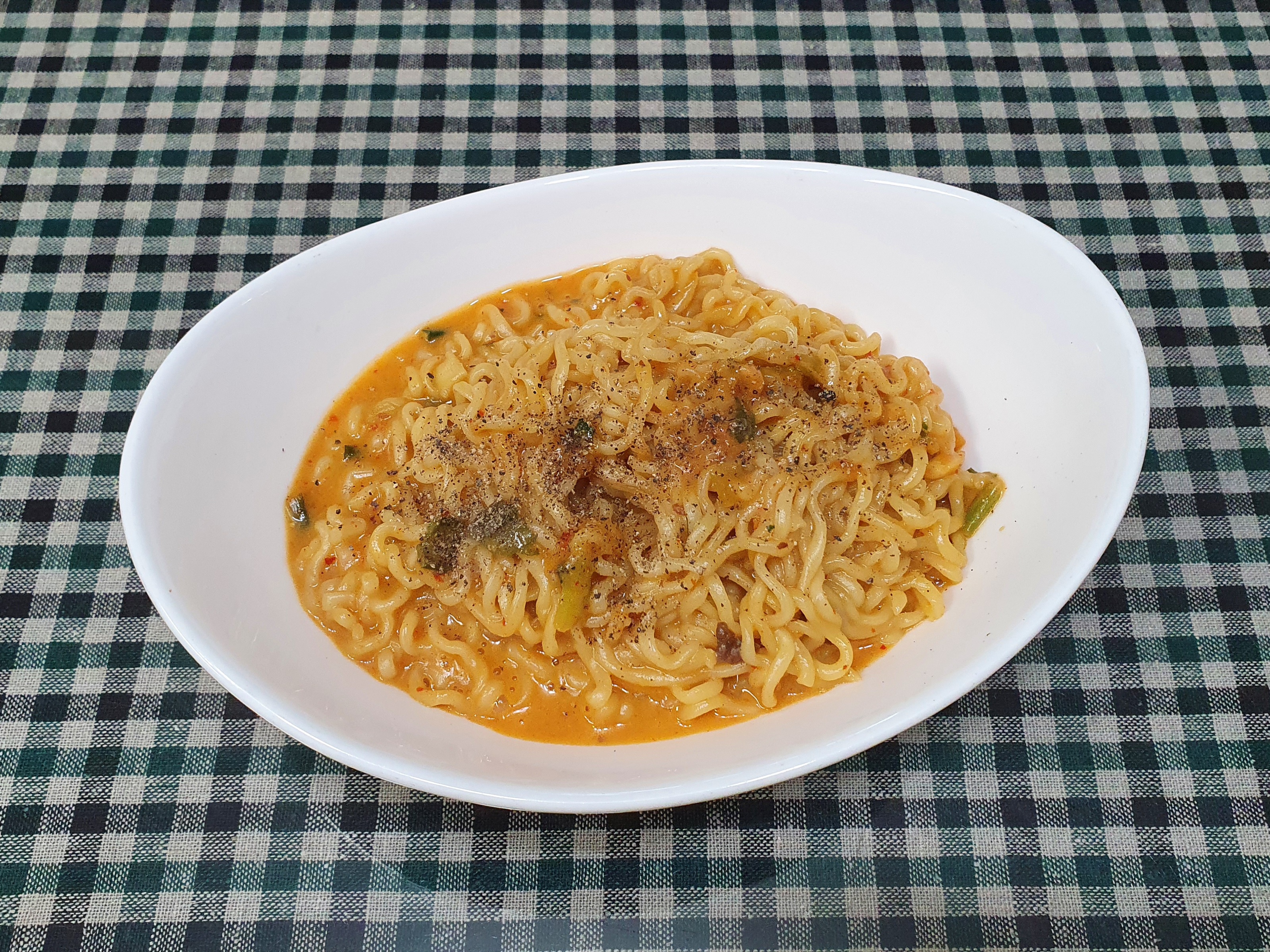 물은 평소 표기 양의 반만 넣고, 건조 야채는 전부, 라면 스프는 반만 넣은 후 고춧가루를 1/2작은술 정도 넣어준다. 국물이 거의 없기 때문에 스프를 다 넣으면 짜서 못 먹으니 반만 넣는데 그러면 매콤한 맛이 부족해지니 고춧가루를 약간 더해준다. 물론 매운 것이 싫다면 생략해도 된다.