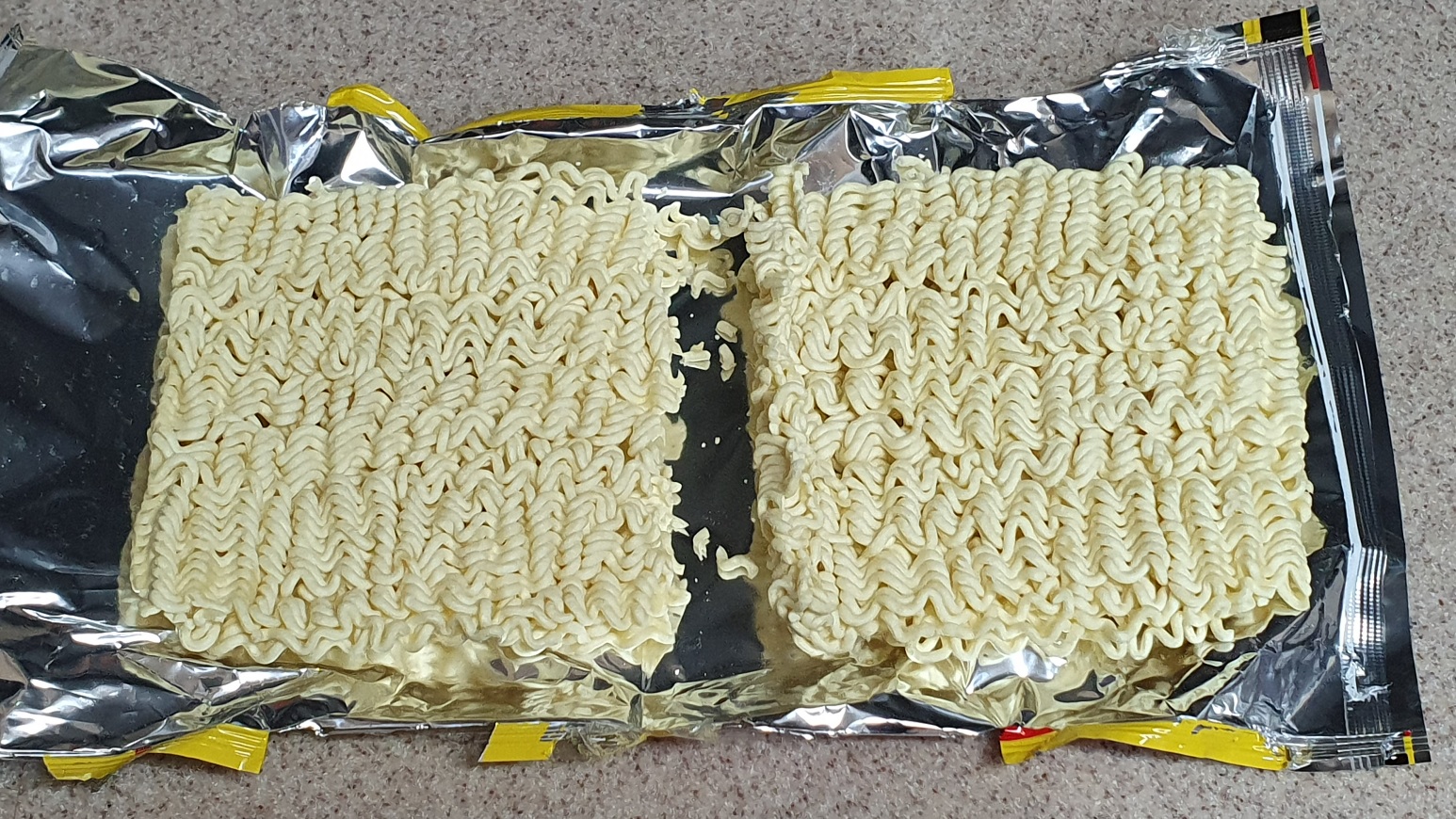 면은 봉지를 분해하듯 뜯어서 길이가 반으로 잘라지게 잘라둔다. U자형인 면의 가운데를 쪼개준다는 느낌으로. 국물이 없고 땅콩버터가 들어가면 농도가 생겨서 면 길이가 일반 면보다 짧아야 먹기가 편하다.