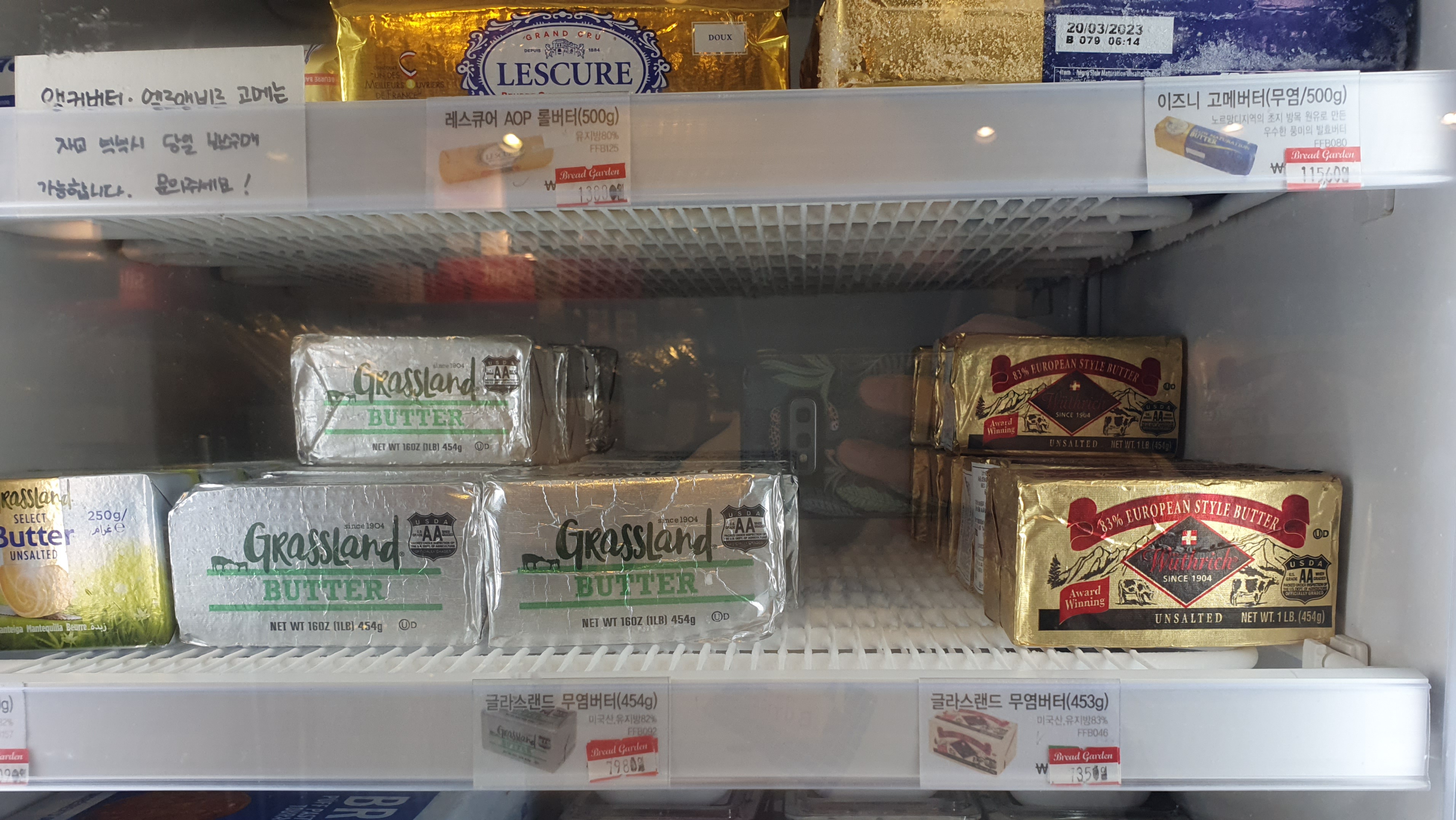 버터 가격 무슨일이냐 진짜. 주로 쓰던 글라스랜드 버터가 거의 2천원이 올랐다. 앵커보다 더 저렴하고 풍미는 나은 것 같아서 애용했는데, 이제는 앵커보다 더 비싸졌네. 옆 냉동고는 사진을 못 찍었는데, 앵커버터는 6,500원이고 회원에 한해 1인 1개만 5,890원으로 세일하고 있었다.