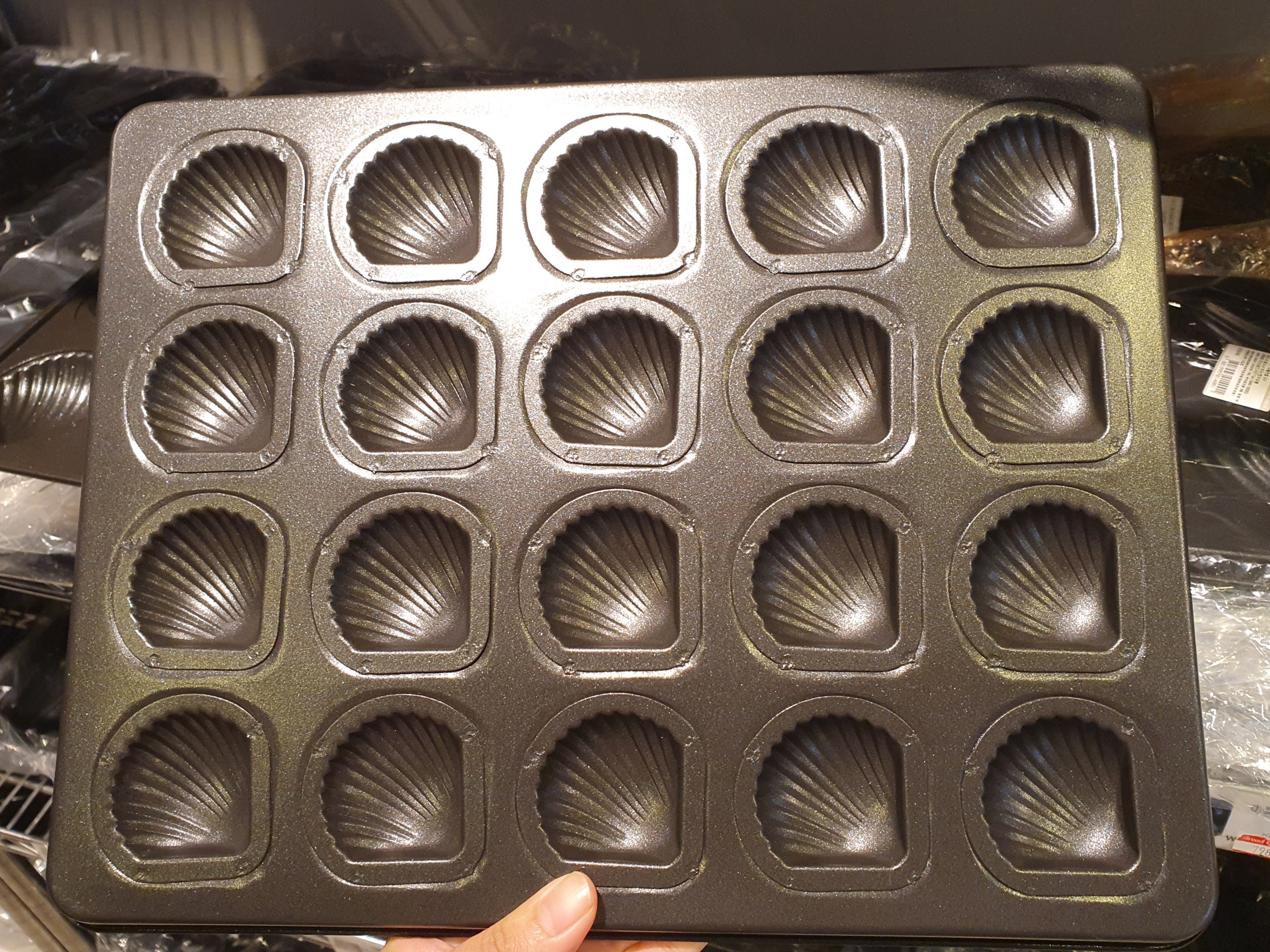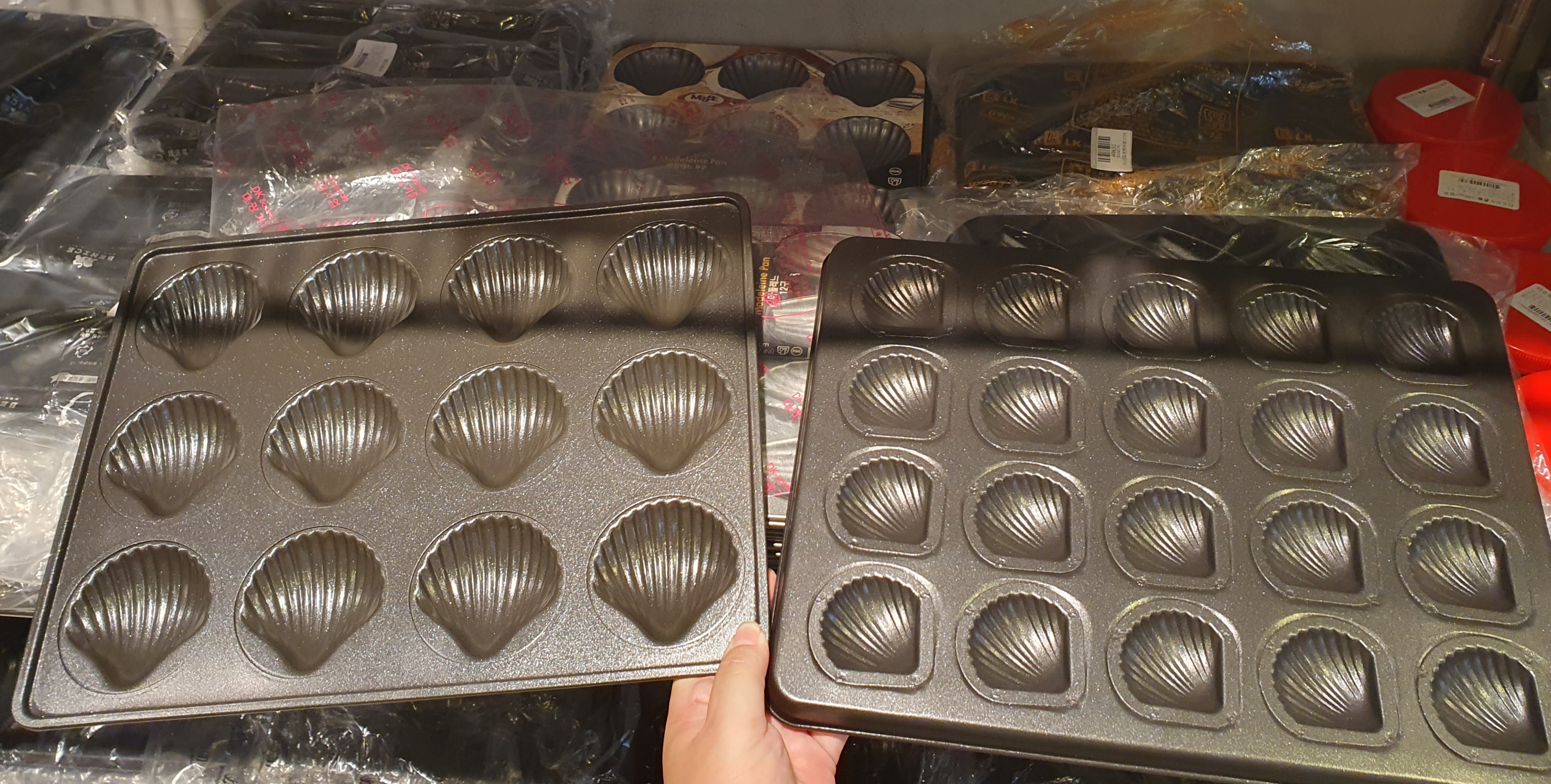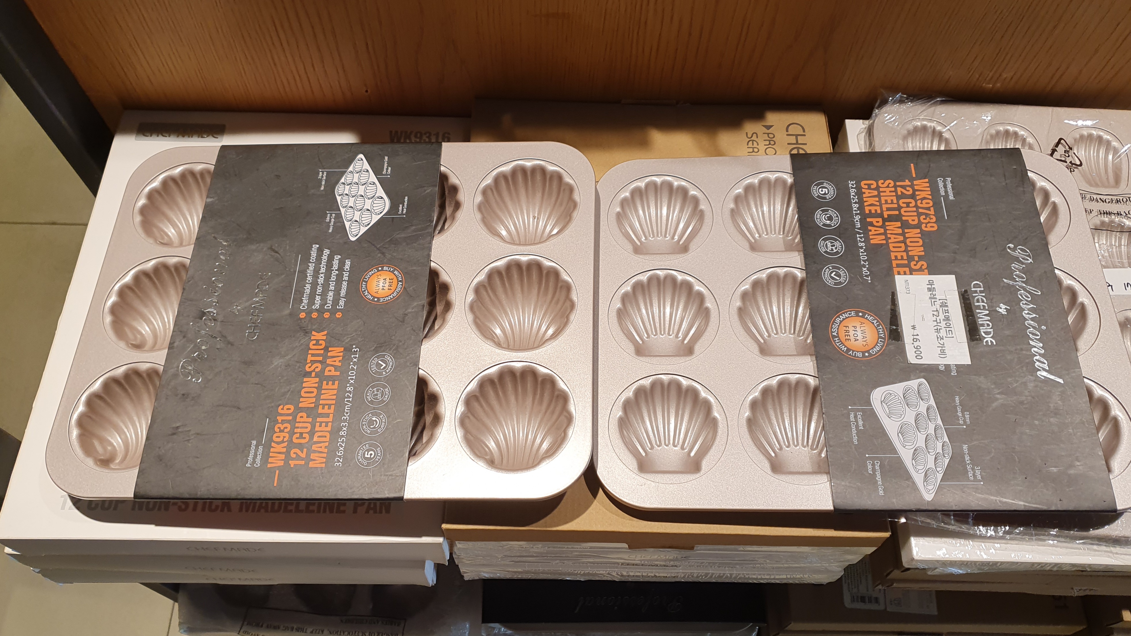 가장 기본적인 마들렌 틀들. MESSE 마들렌 틀은 가격인상 없이 그대로 9,900원이다. 그 옆은 미니오븐들 용으로 쓰는 6구짜리 마들렌틀. 만원 초반이라 가격대는 괜찮은데, 내 오븐은 42L라 굳이 6구를 여러 개 살 필요없이 12구를 사기로 했다. MESSE 조가비 틀 2개가 한 줄에 들어가면 딱 좋을텐데 1cm 정도 차이로 두 판이 안들어가서 아쉽다.