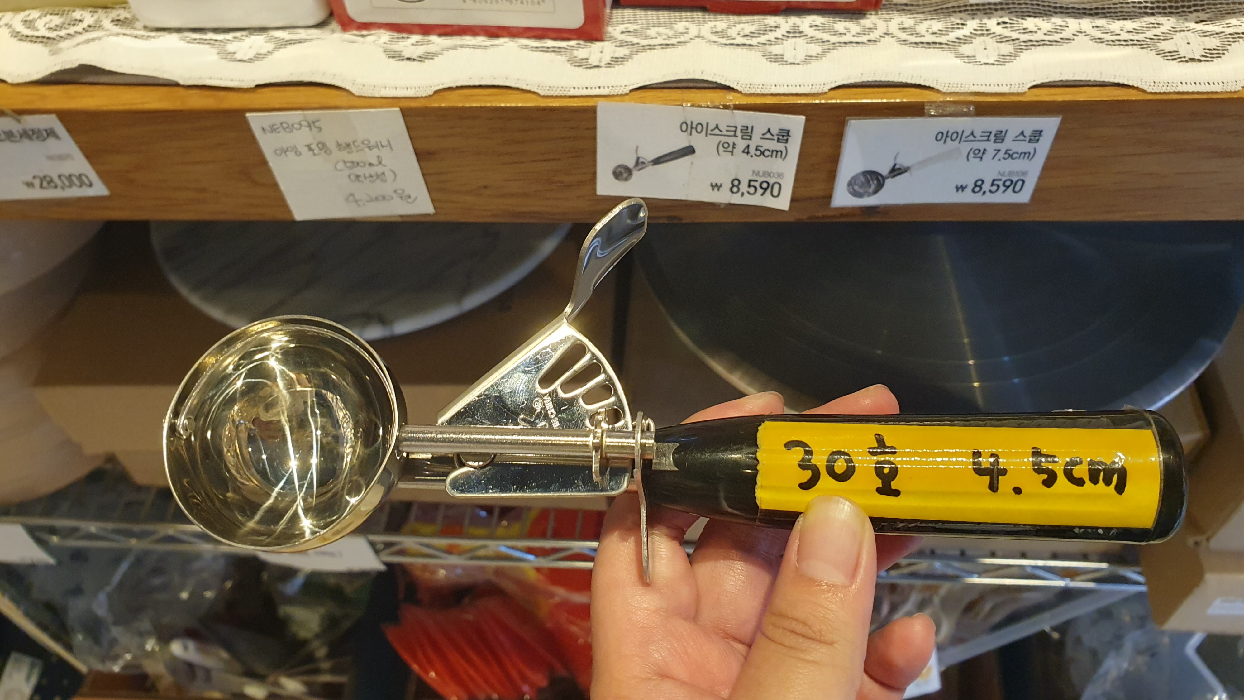 약간 탑나던 아이스크림 스쿱. 7.5센치는 큰 아메리칸 스타일 쿠키를 구울 때 쓰는 용인 듯 하고, 이 작은 사이즈는 반죽 소분하거나 아이스크림 뜰 때 딱 좋은 크기인 듯. 약간 탐났지만 딱히 당장 필요한 건 아니라 내려두었다.