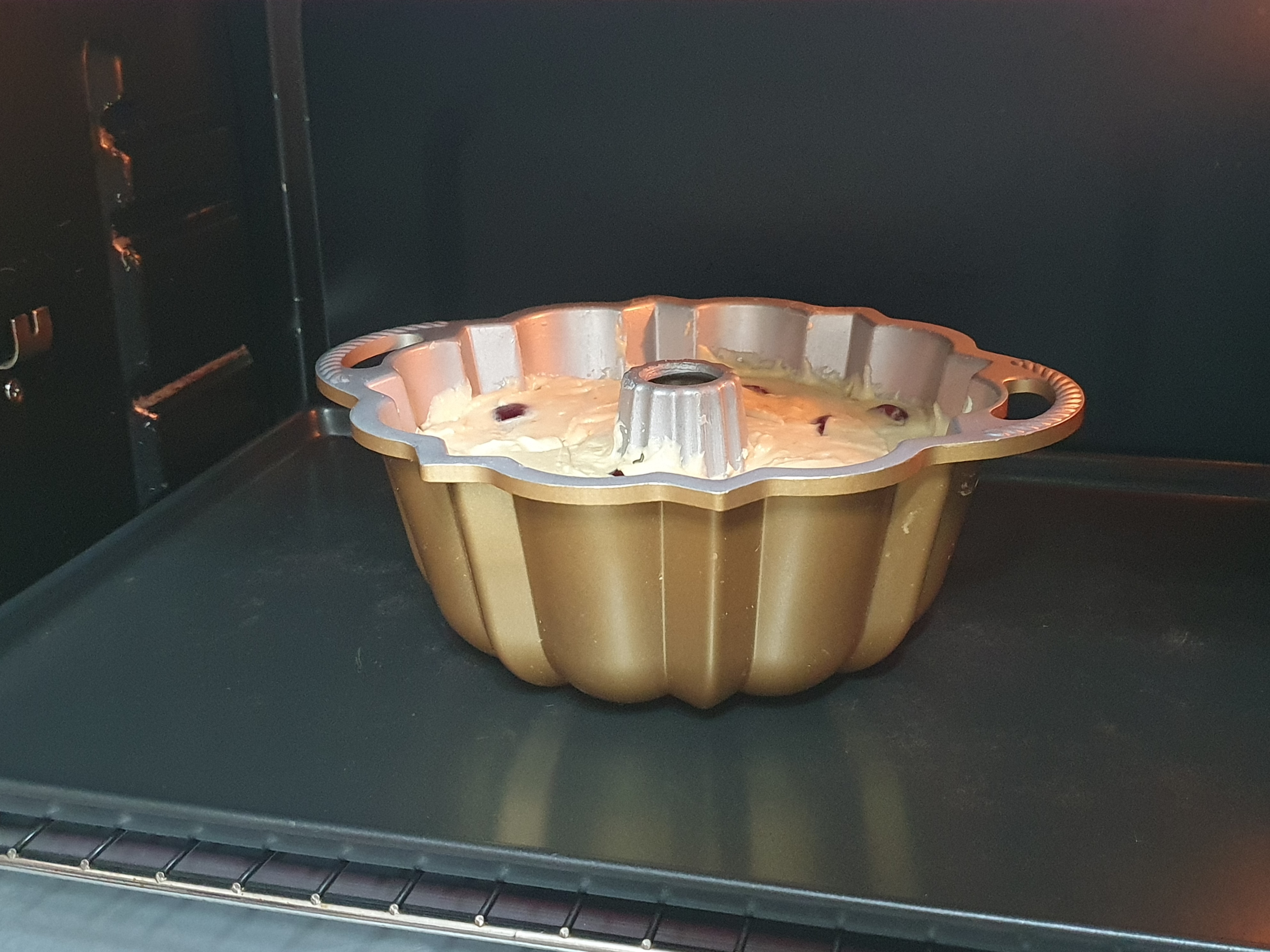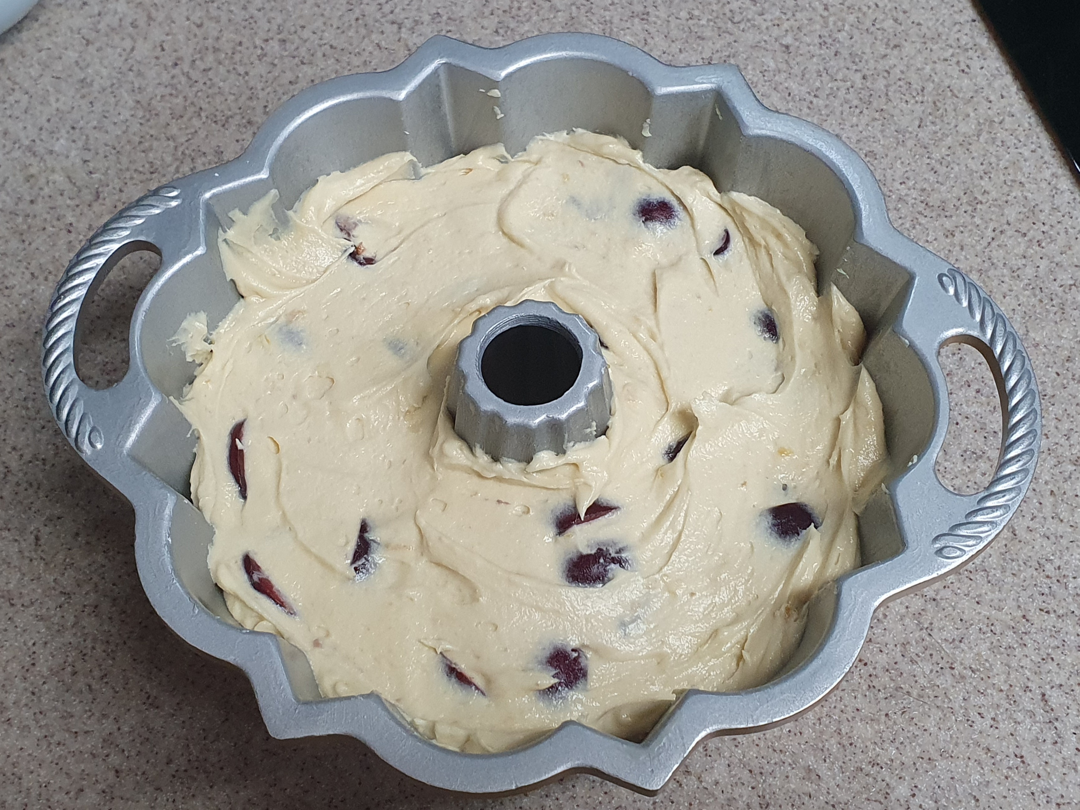 미리 이형제를 칠하고 냉장고에 넣어 차갑게 둔 노르딕웨어 번트팬에 팬닝한다. 이형제는 실온버터 2 : 전분 1을 섞어서 사용하면 되고, 번트틀은 가운데 구멍 부분을 잘 칠해줘야한다. 체리를 반죽에 섞어서 팬닝하면 아래로 다 가라앉으니 우선 맨 반죽을 30% 체운 후 밀가루 코팅한 체리 1/2을 골고루 올려주고, 가볍게 눌러 박은 후 틀을 내리쳐 기포를 빼고 남은체리는 70% 남은 반죽에 섞어 팬닝했다. 윗면을 고르게 다듬고 바닥에 몇 번 내리쳐서 기포를 빼 낸 후 구워야 나중에 케익에 빈 공간이 없다.