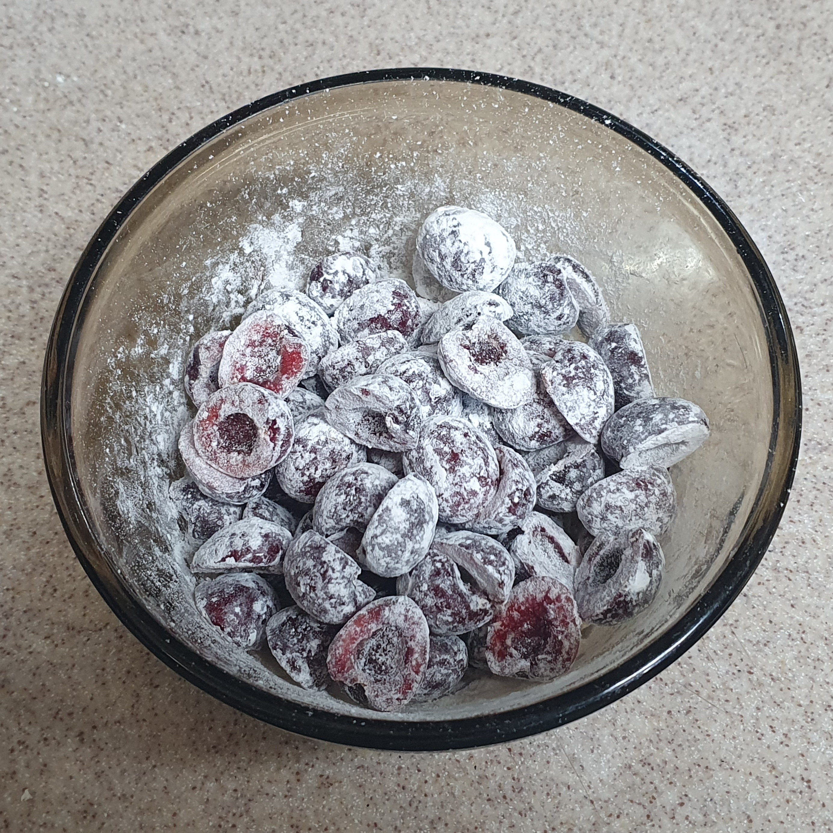 이제 여기에 체리 생과를 넣는데, 말린 것이라면 럼에 한번 불려 바로 넣으면 되지만 생과는 꼭 밀가루로 한번 옷을 입혀주어야 나중에 질척하지 않다. 박력분 10g을 넣고 그릇을 흔들어서 체리에 골고루 밀가루 옷이 입혀지게 한다.