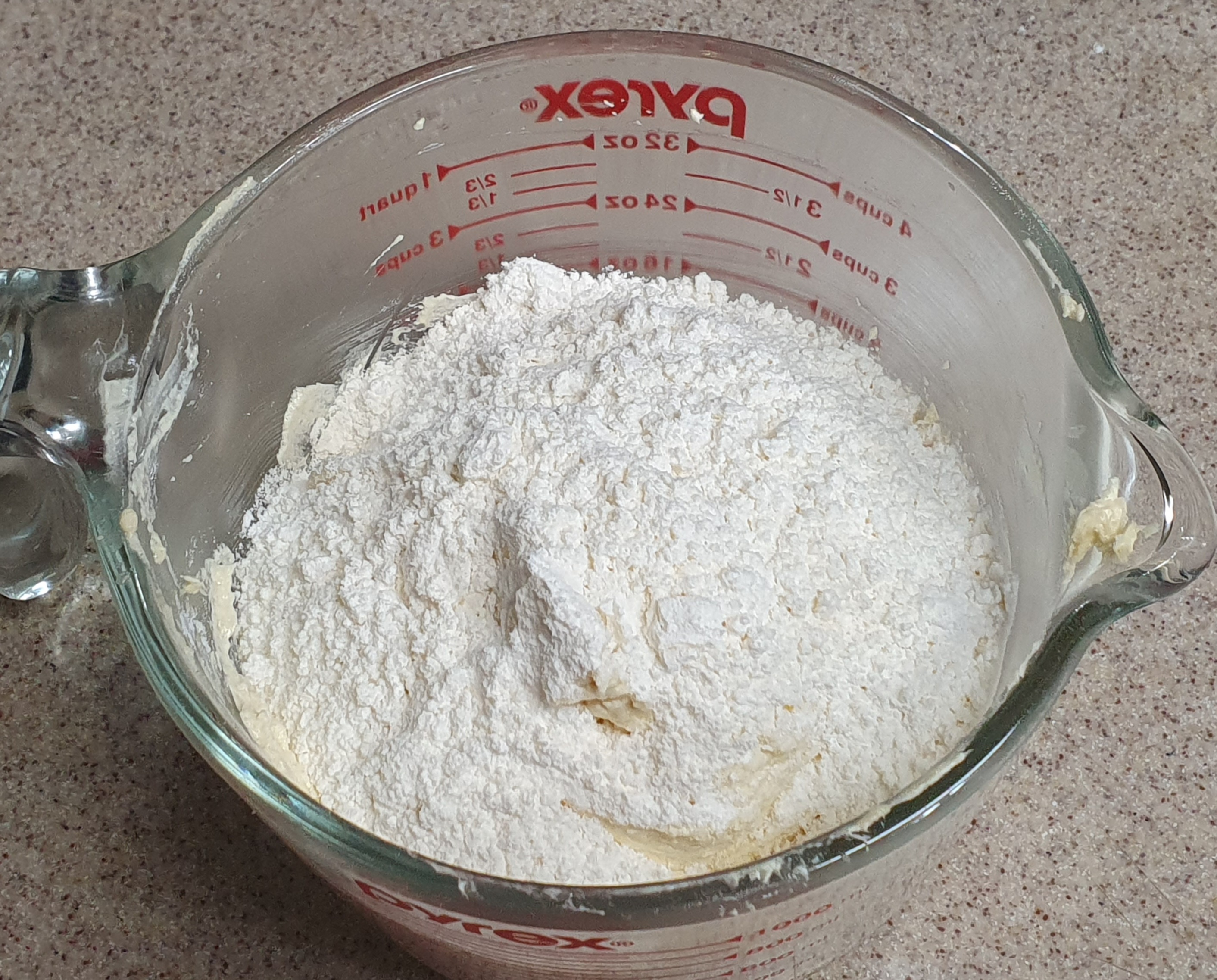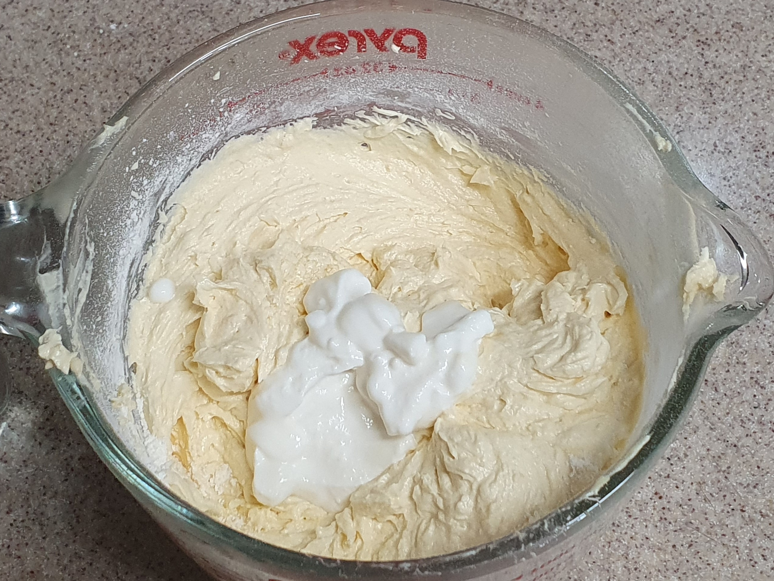 가루류 1/2을 넣고 요거트를 넣은 후, 다시 가루류 1/2을 넣으면 기본 반죽은 마무리.