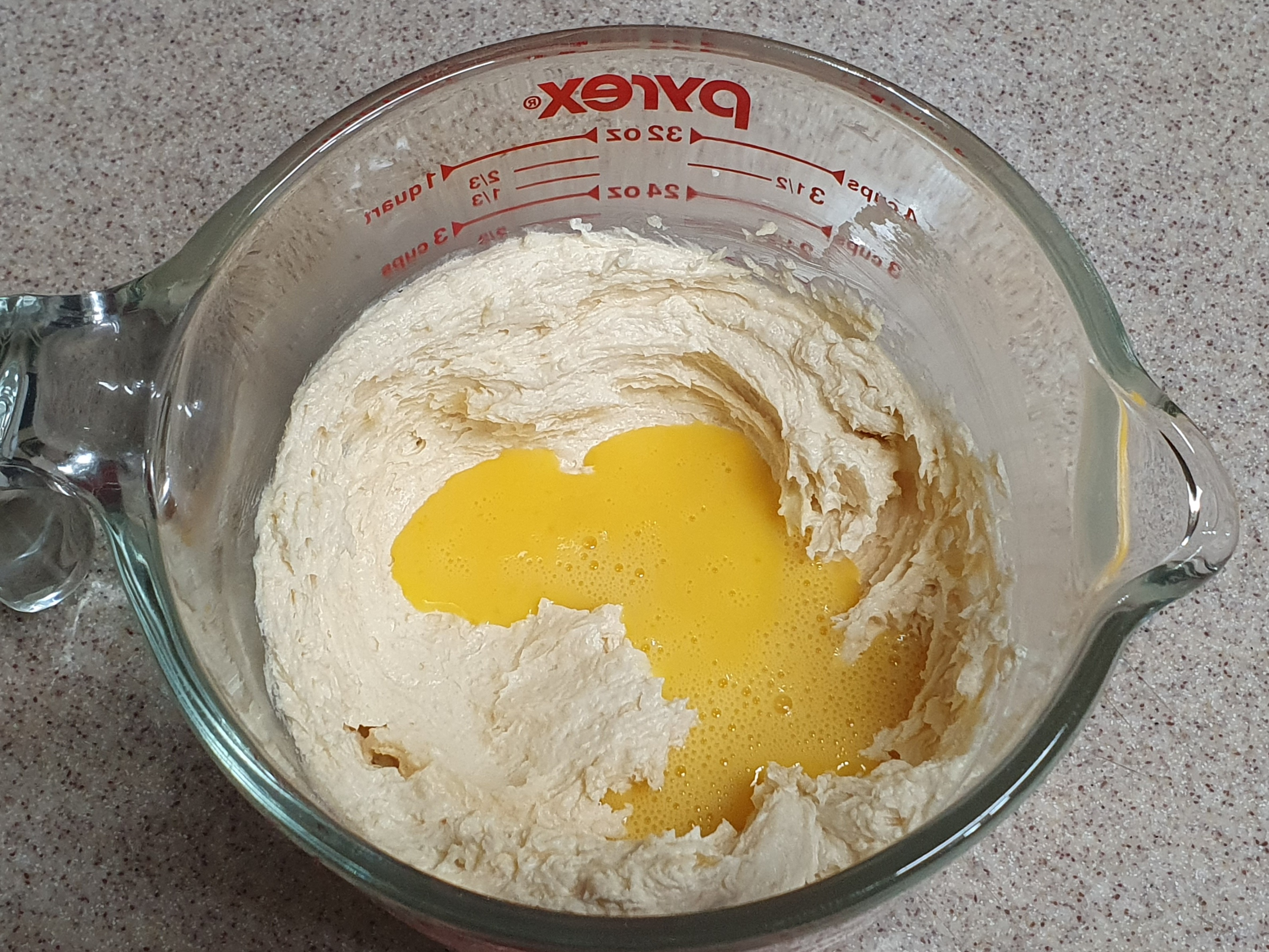 설탕이 들어가서 버터가 하얗게 변하고 공기포집이 되었다면 미지근한 온도인 계란+럼 믹스를 넣는다. 럼이 없다면 바닐라 익스트렉을 넣어도 된다. 한번에 다 넣지말고 5~6번에 나누어 넣는데, 계란은 처음에 30% 정도로 시작해서 양을 점점 줄여가면서 넣고, 한번 넣고 나서 1분 30초 이상 충분히 휘핑해주어야 분리되지 않는다. 만약 4~5번째쯤 분리되면 가루류를 한큰술 미리 넣고 휘핑한다.