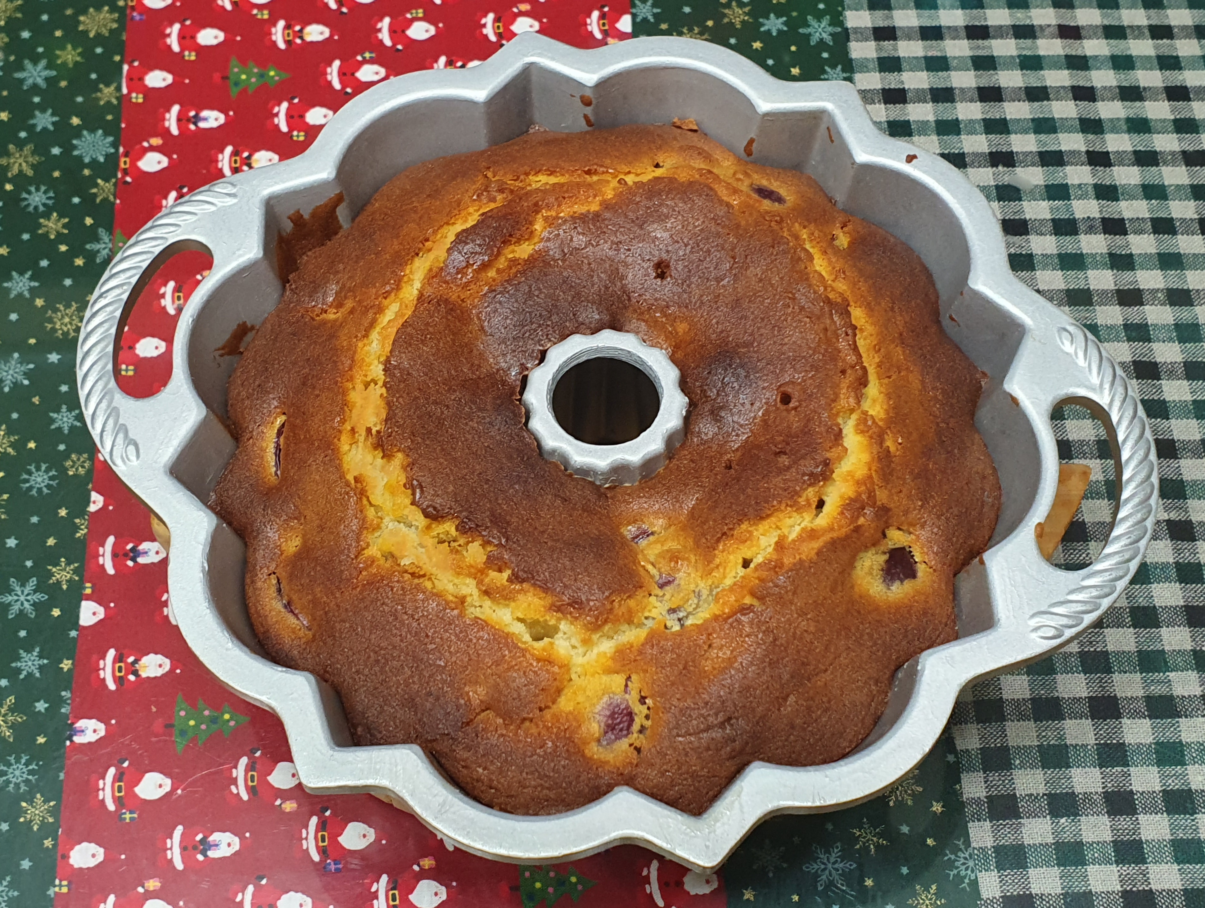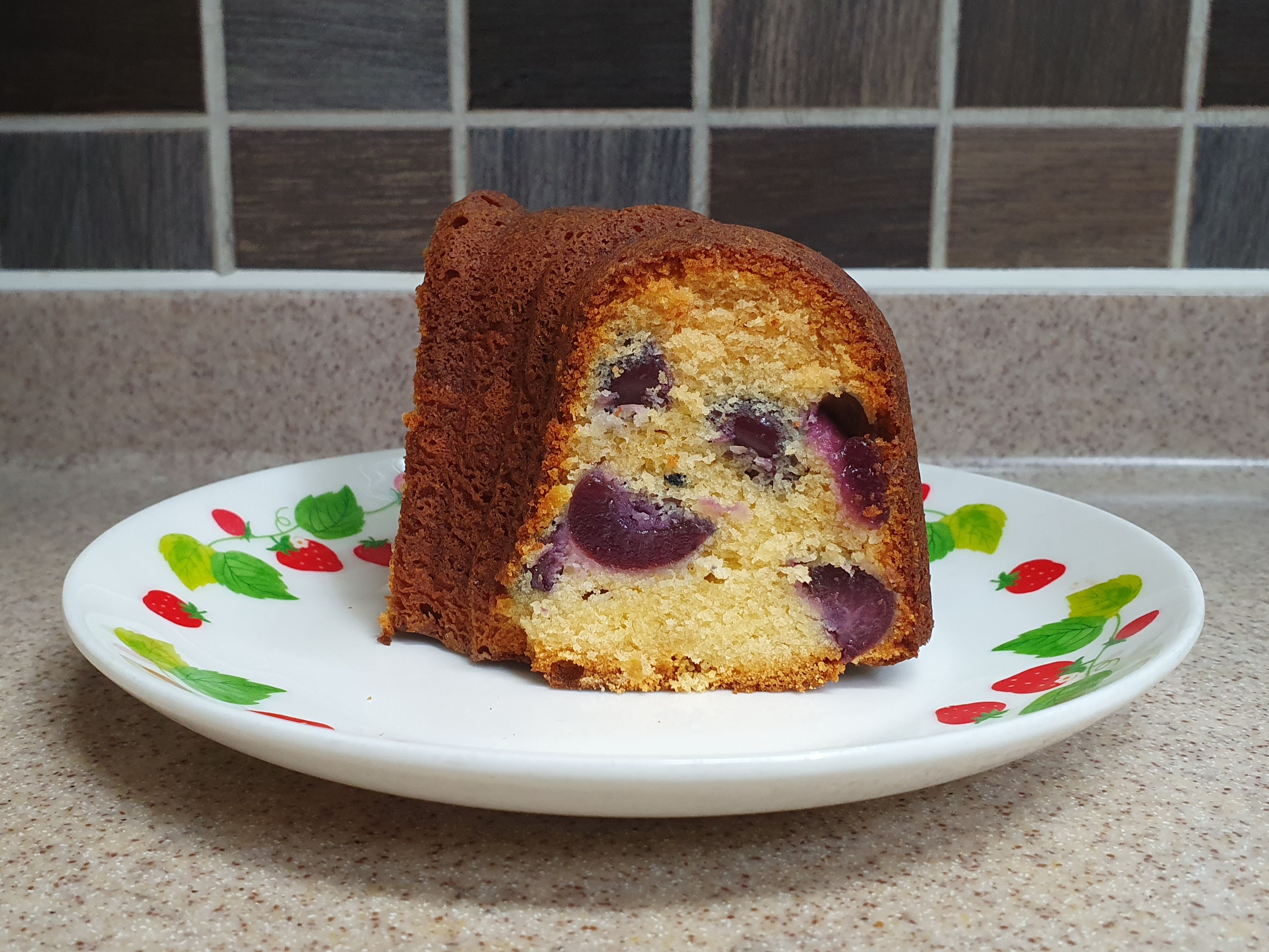 팬닝을 신경써서 했더니 겉으로는 체리가 든 티가 전혀 나지 않는다. 뭐 말린 체리라면 티가 나도 상관없지만, 이번처럼 생과를 넣은 경우에 틀에 체리 생과가 닿으면 수분때문에 질척해질 수 있으니 체리를 최대한 안으로 숨기는 것이 좋다. 색이 조금 연했다면 더 좋았을 것 같기는 한데 조금 오래 굽기도 했지만 자일로스 설탕을 써서 구움색이 진하게 나온 것 같다. 일반 백설탕을 사용하면 조금 더 밝은 브라운 색으로 완성될 듯.