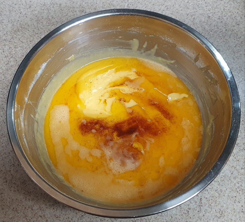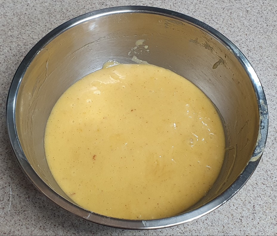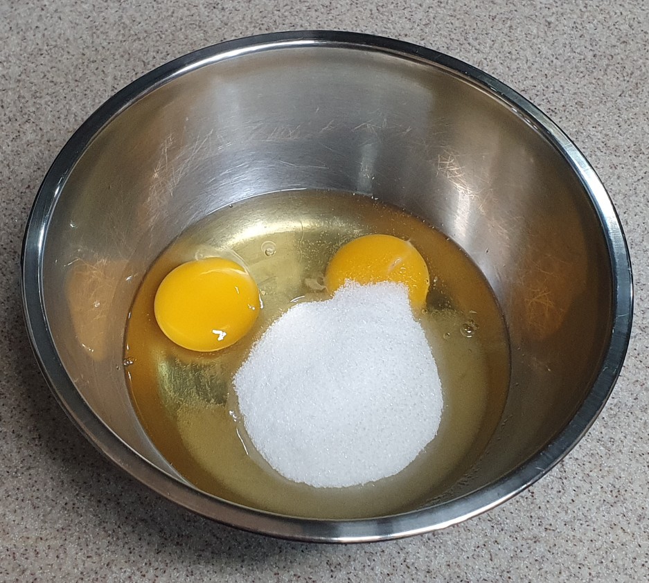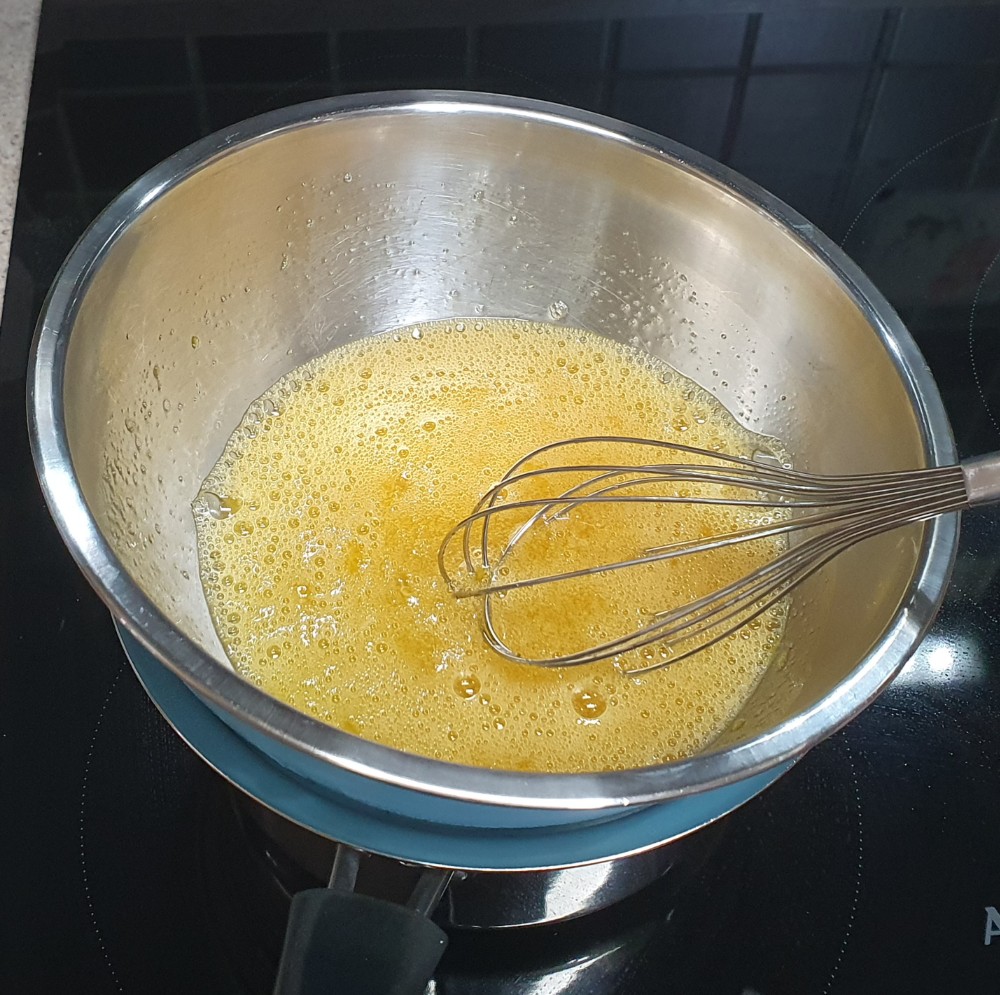 버터를 다 태웠으면 계란 2개에 설탕, 디사론노, 소금을 넣고 중탕한다. 끓는 물 위에 올리면 계란이 익을 수도 있으니 물이 어느정도 끓으면 불을 중약불로 낮추고 수증기로 중탕해서 설탕이 다 녹고 잔거품이 날 정도로 섞였다(50도쯤) 싶으면 불에서 내린다.