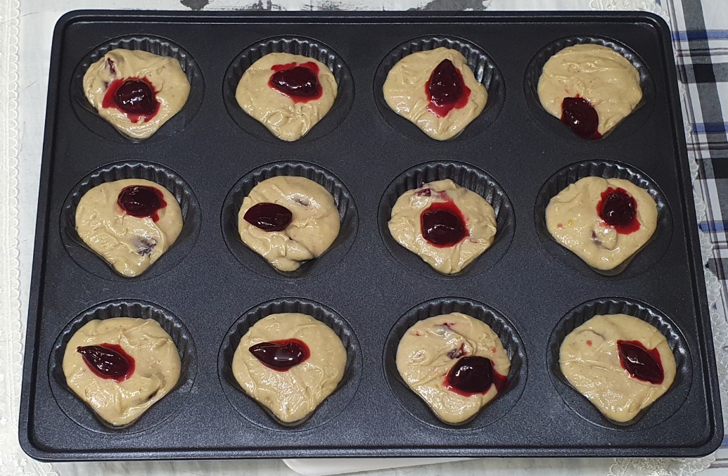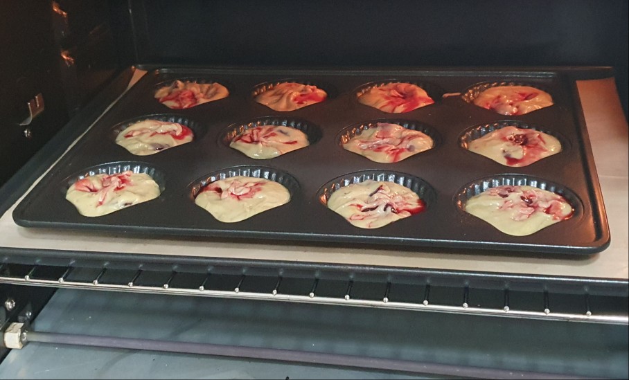 콩포트 60g이면 충분히 달달하게 되었을텐데 체리 과육이 크다보니 모양새가 덜 나는 것 같아서 체리 과육을 마들렌 1개당 한 조각씩 추가해서 넣었다. 저렇게 올린 상태에서 바로 구우면 콩포트가 타 버리니 약간 반죽에 파묻어서 부풀어오르면 마들렌 안에 묻히게 섞어줬다.