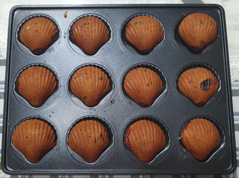 180도로 20분 이상 예열한 오븐 중간단에서 170도로 10분(조가비), 12분(왕조가비) 굽는다. 배꼽이 완전히 올라오면 한번 앞뒤를 바꿔주고 각각 10분, 11분 째에 꼬치로 찔러서 테스트 해 보고 다 익었다면 꺼낸다. 덜 익었다면 1분 단위로 확인해가면서 구우면 된다. 콩포트가 통으로 들어가다보니 다른 마들렌에 비해 조금 더 오래 구워야한다.