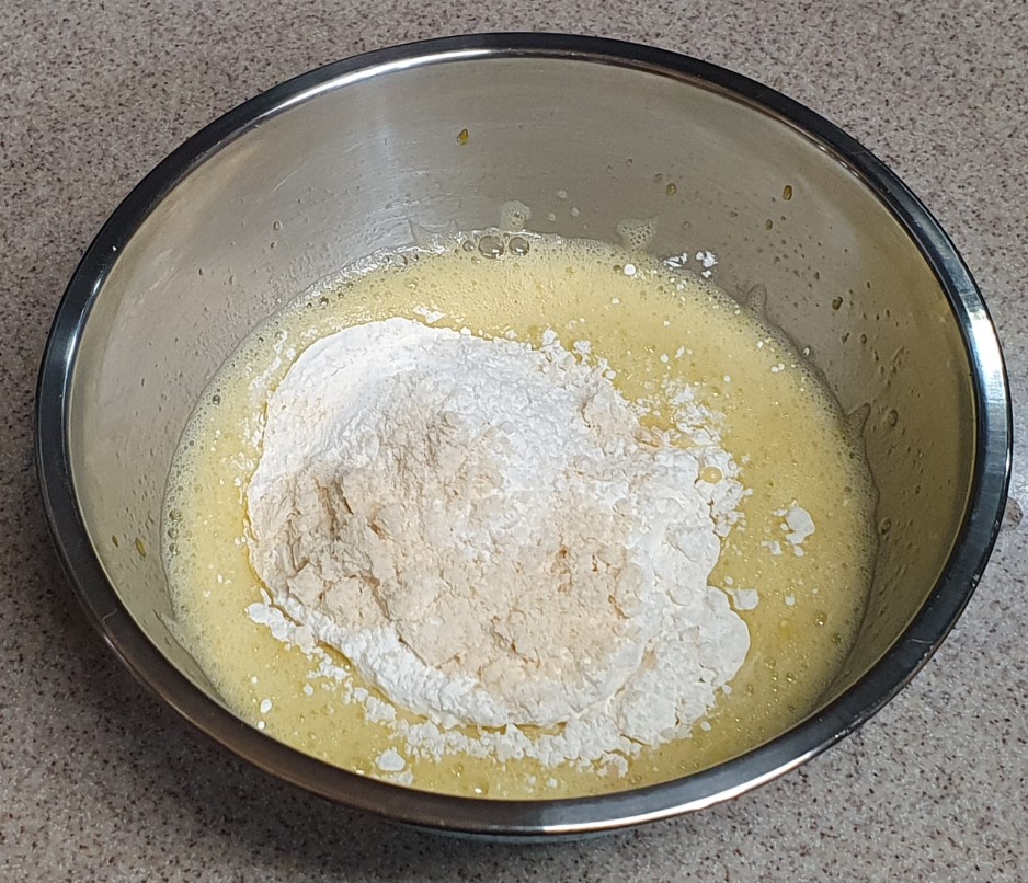 중탕한 계란물에 밀가루와 아몬드가루, 베이킹파우더를 넣고 거품기로 잘 섞는다. 밀가루가 다 섞이고 나서도 한 10번정도 거세게 섞어서 글루텐을 좀 만들어준 후 태운 버터를 넣는다. 버터 온도는 50도 전후로 맞춰 넣는데, 온도가 높으면 베이킹파우더가 반응하고 낮으면 기름이 분리되니 온도계를 꼭 사용해야한다.