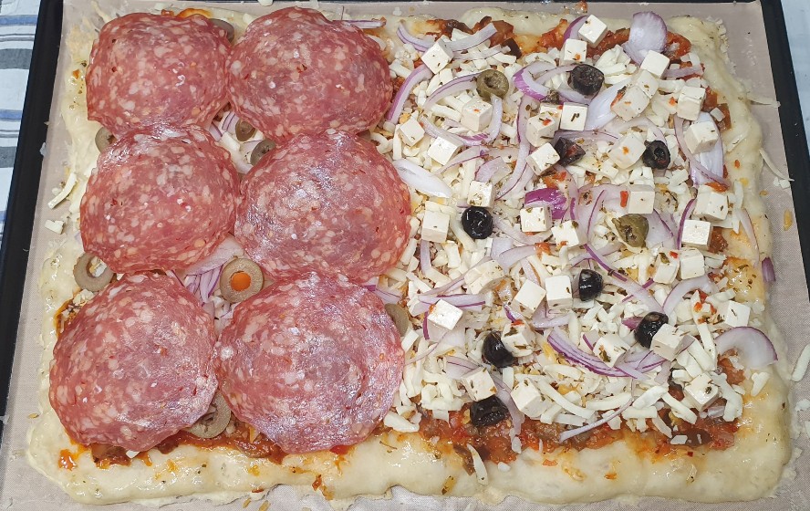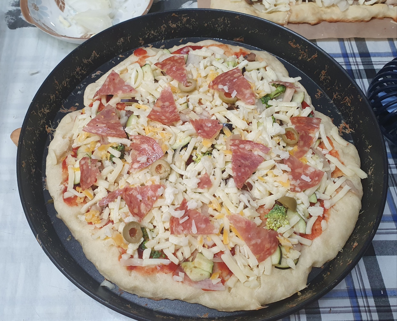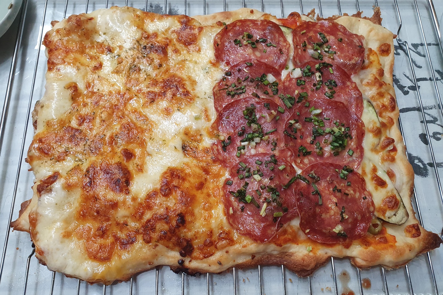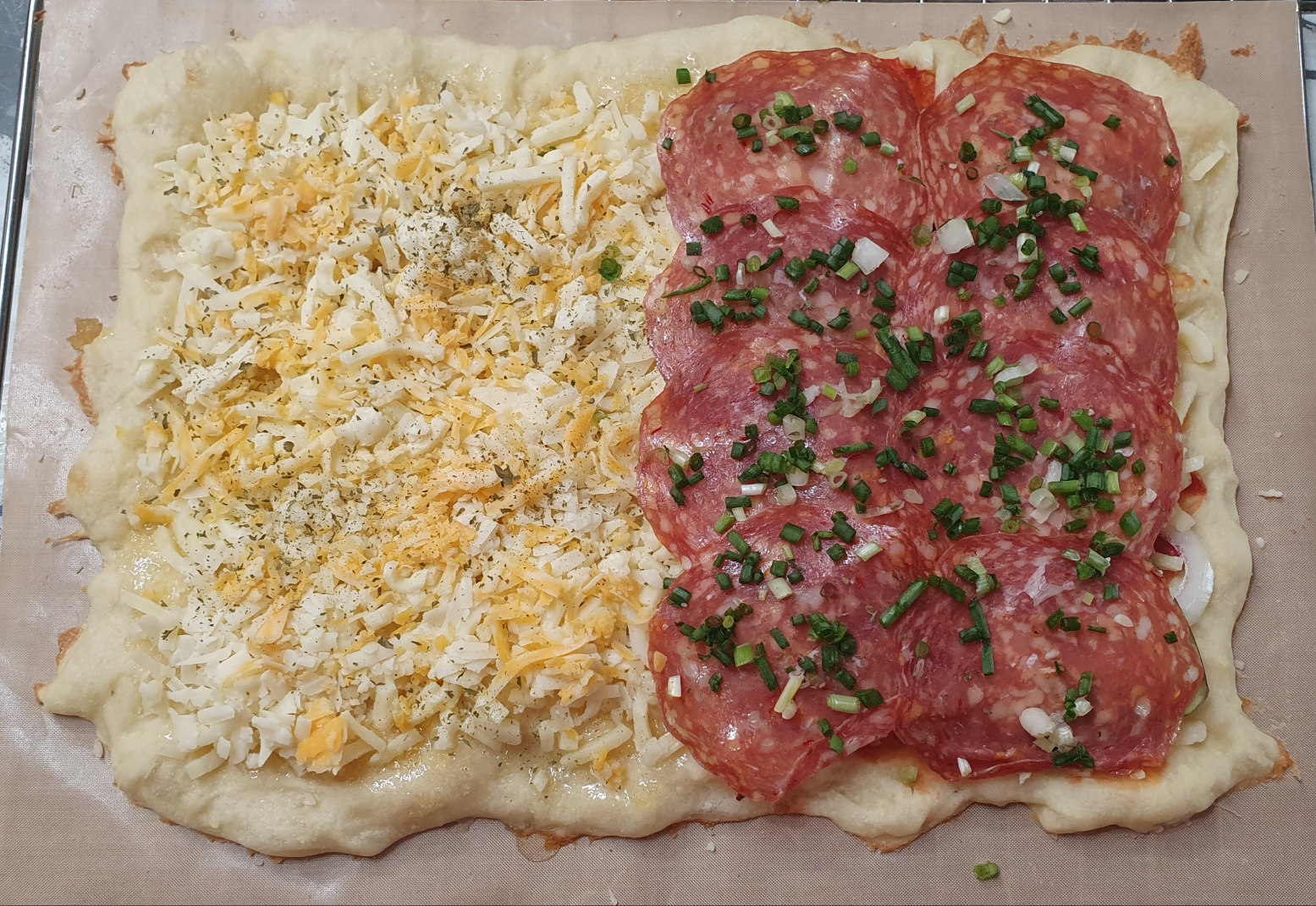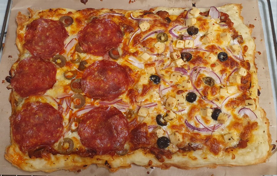 사각피자 한 팬에 밀가루 230~250g정도의 도우가 들어가고, 한 판을 꽉 채워서 구우면 성인 3인분 식사 정도 된다. 두 판 구우면 성인 5~6명 정도 먹을 수 있더라. 이하 사진은 굽기 전 / 구운 후 피자 사진이고, 토핑은 따로 계량을 안 해서 간략하게 적는다.