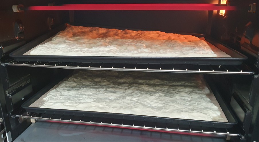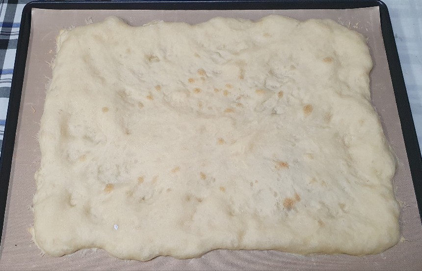 토핑 준비가 다 되었다면 예열을 시작하고, 테프론 시트에 반죽을 얇게 편다. 수분량이 많은 반죽이라 밀대로 밀리지는 않고 손가락에 물을 묻히고 열심히 눌러 펴다보면 짜증나게 다시 줄어들지만 얼추 테프론시트만큼 커지긴 한다. 구멍이 나도 구우면서 팽창하는 편이라 최대한 얇게 펴는 것이 중요하다.