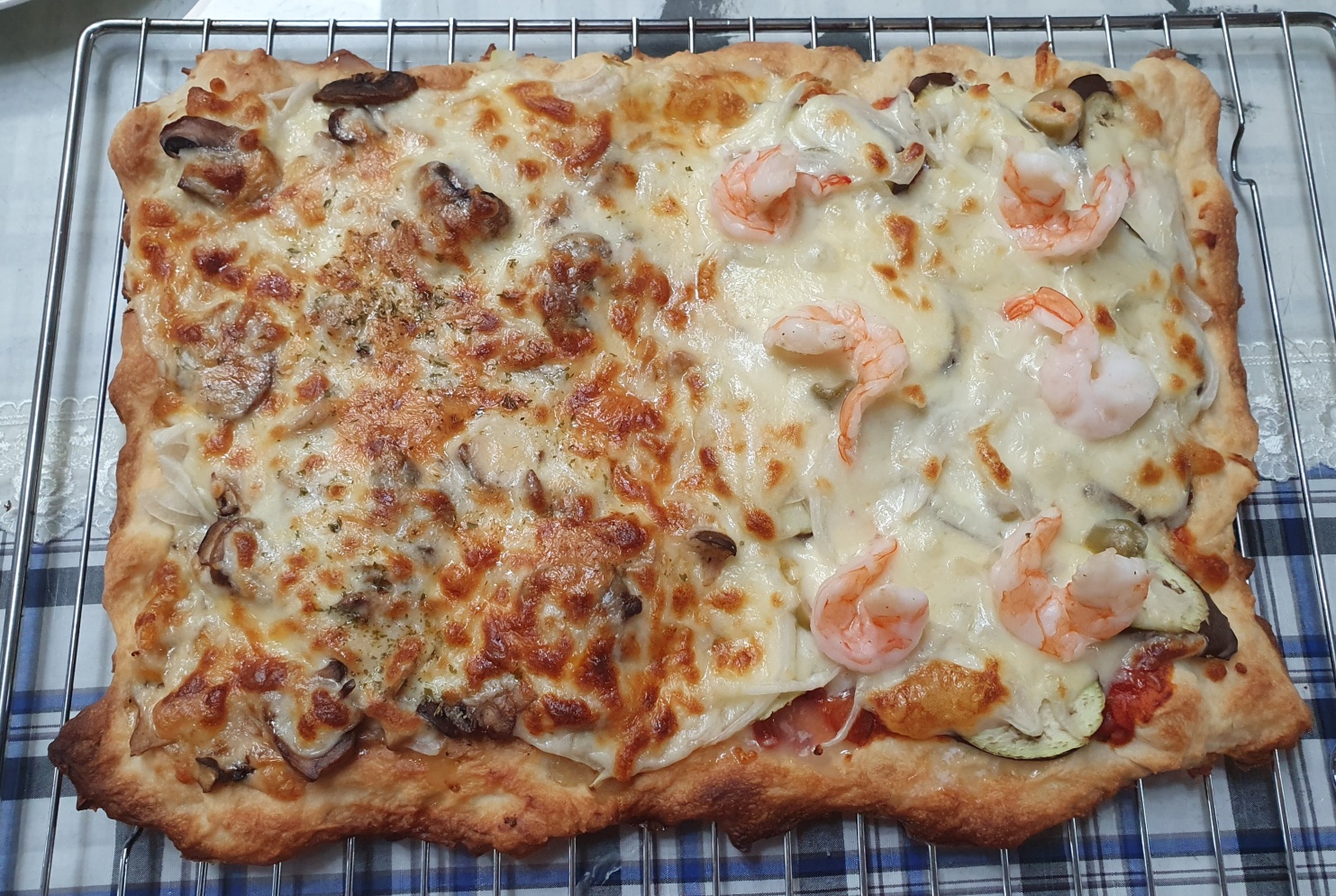 솔직히 간단한 건 아닌데... 그냥 유튜브 보다가 피자가 만들어보고싶어서 만들었다. 마침 집에 피자 토핑할 재료도 많겠다 이스트만 사면 되니까 간단하게 무반죽법 도우로 만들지 뭐 했다고 토핑을 너무 다양하게 올려버렸네. 얇은 포카치아 스타일 도우 위에 각종 치즈와 토핑을 얹었는데 빵은 구수하고 바삭한데다 각종 토핑을 듬뿍 넣었으니 당연히 파는 것보다는 훨씬 맛있다. 날이 더워서 발효도 잘 되고 폴딩만 몇번 하면 되니 간편하고 맛도 맛있긴 한데 역시 빵은 반죽기가 있어야 마음편하게 만들 듯.