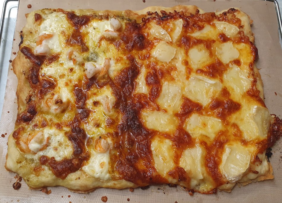 굽기 전후 피자 좌우가 바뀌었네... 완성품 기준으로 왼쪽은 새우 바질페스토 마스카포네 피자고 오른쪽은 콰트로 포르마주 피자다. 새우 피자는 잭슨피자의 레전드에 새우를 추가한 느낌으로 구상했는데 바질페스토를 많이 발랐더니 좀 짰다. 적은 대로 1큰술만 딱 넣으면 괜찮을 듯. 새우는 반을 갈라서 밑간하고 한번 데쳐 올렸는데 그냥 바로 올려도 되겠고, 마스카포네는 남은 걸 다 사용했는데 약간 적었다. 조금 더 많았어야 맛있을 듯. 맛있는 바질페스토가 있다면 그냥 새우 빼고 바질페스토+모짜렐라+마스카포네 조합으로 만드는 게 낫겠다.