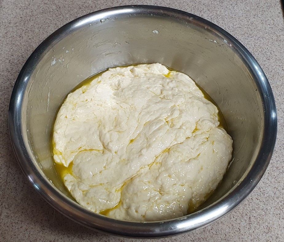 미지근한 물에 이스트와 소금과 설탕을 넣어 다 녹을 때까지 젓는다. 몇번 저으면 이스트 입자가 다 풀어지는데 그러면 밀가루를 넣고 실리콘 주걱으로 섞어서 반죽을 만든다. 원형을 그려가며 밀가루에 물이 흡수되게 한 다음 힘을 주어 주걱을 휘저어 한 덩어리로 만들고, 올리브오일 40g을 넣고 반죽 겉면을 코팅한다. 굳이 지금 오일을 흡수시키지 않아도 나중에 폴딩하다보면 흡수된다.