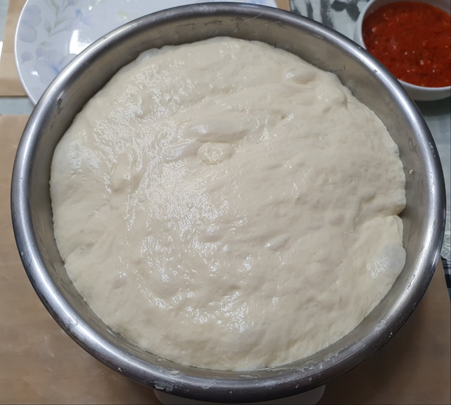 그리고 집에서 피자 해 먹었으니 되었다 했는데 어쩌다보니 조카를 꼬시게 되어... 한번 더 했다. 집에서 하는 쿠킹클래스 같은 거지... 이번에는 전날 미리 반죽을 해 뒀는데, 냉장숙성을 12시간 정도 할 거라 올리브 오일 반을 밀가루 넣기 전에 넣어 반죽하고 나머지 반으로 코팅한 후 3번 폴딩하고 30분 후 냉장고에서 12시간 숙성했다. 오래 발효할거라 500g에 이스트 4g만 넣고 반죽해도 반죽이 잘 나왔다. 12시간 이상 숙성할거라면 이스트를 반으로 줄여도 되겠네. 다음에 이 반죽 개량해서 포카치아 해봐야겠다.