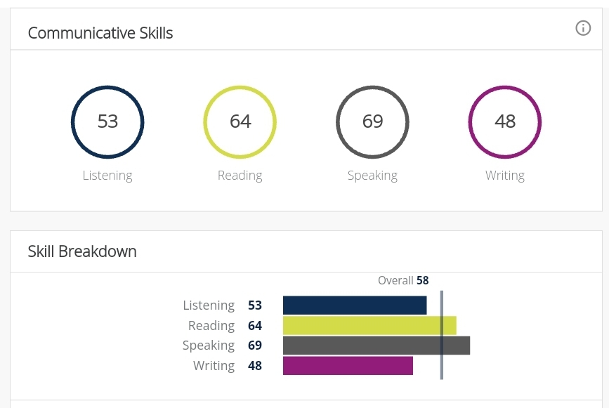 그래서 내 점수는 이렇다. Overall 58 L 53 R 64 S 69 W 48. Writing 점수가 거지같은 건 WE와 WFD때문일거고, Listening이 58을 못 넘은 건 RS와 WFD때문일 것 같다. Reading과 Speaking은 뭐 이정도면 공부한 것 치고는 만족한다.