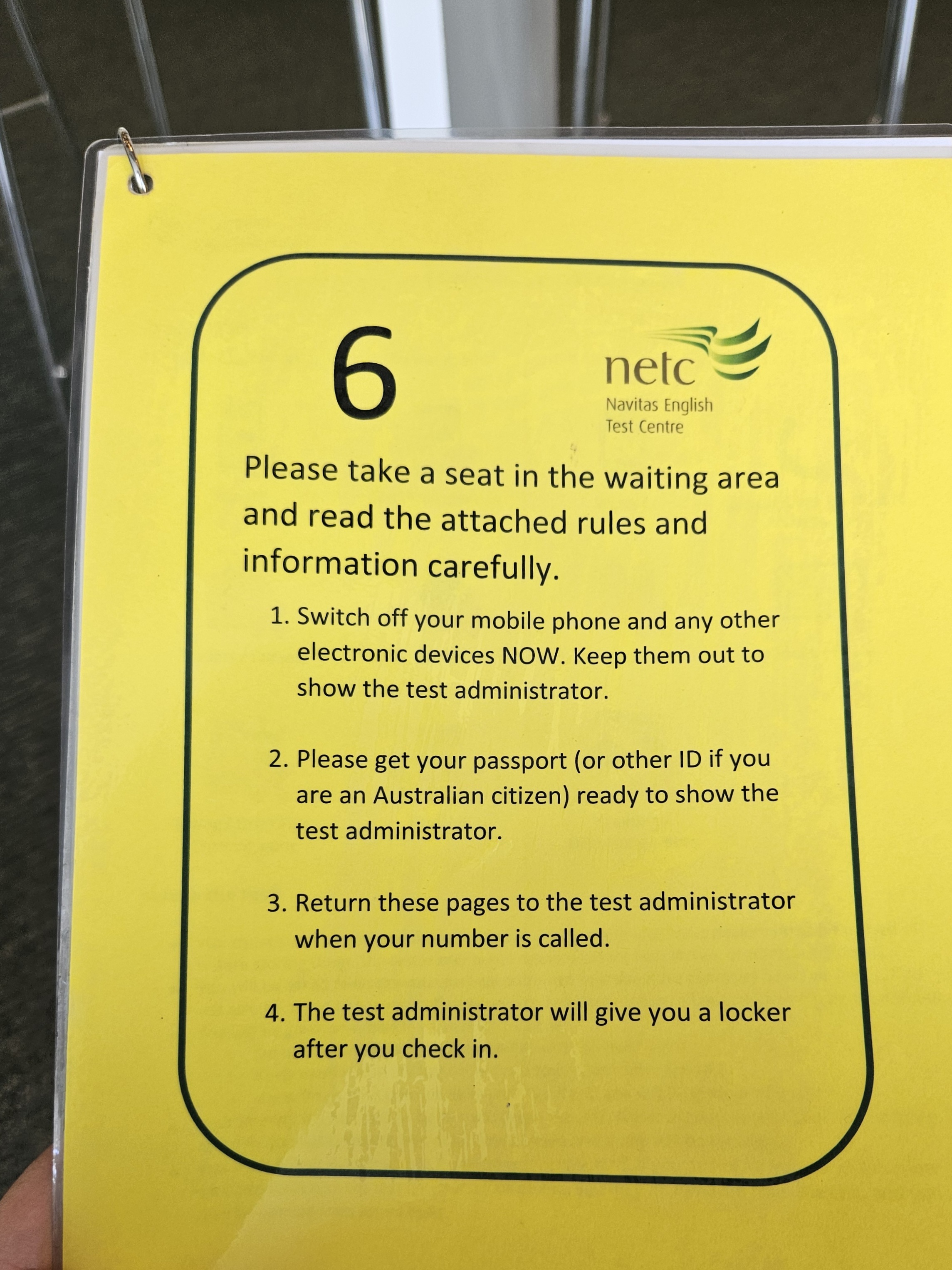 들어가면 몇번째 순서인지 말해주고, 이렇게 안내문을 준다. 나는 6번. 이 번호가 락커 넘버이기도 하다. 보다시피 들어온 순간부터 핸드폰, 전자기기 전부 꺼야하고 공부할 자료 하나도 못 본다. 여권 외엔 다 사물함에 넣고 대기하다가 사진찍고, 지문찍고 계속 앉아서 그냥 대기해야한다. 템플릿 아직 다 못 외웠는데 괜히 일찍와서 앉아있기만 했네. 30분 전에 딱 맞춰가도 충분히 오래 기다린다.