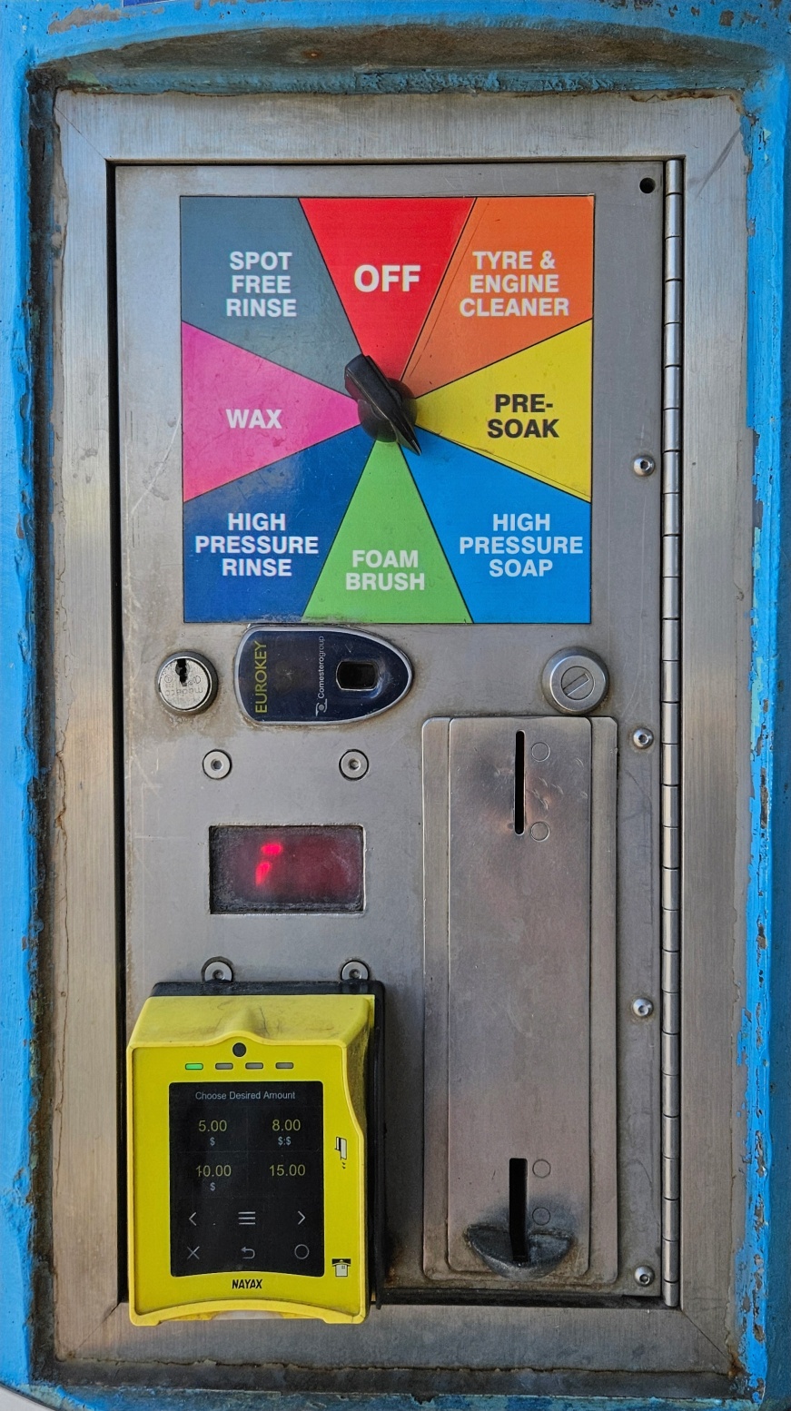어쨌든 그래서 어떻게 쓰는거냐면, 맨 앞에 있는 기계에서 모드를 고르고 코인을 넣거나 카드 결제를 하면 설정된 모드에 따라서 물이든 소프든 폼이든 나온다. 세차장 왼쪽에 포밍 브러쉬가 있고, 그 옆 코일선으로 연결된건 왁스. 그 외 물과 약품 기타 등등은 전부 오른쪽 건에서 나온다고 한다.