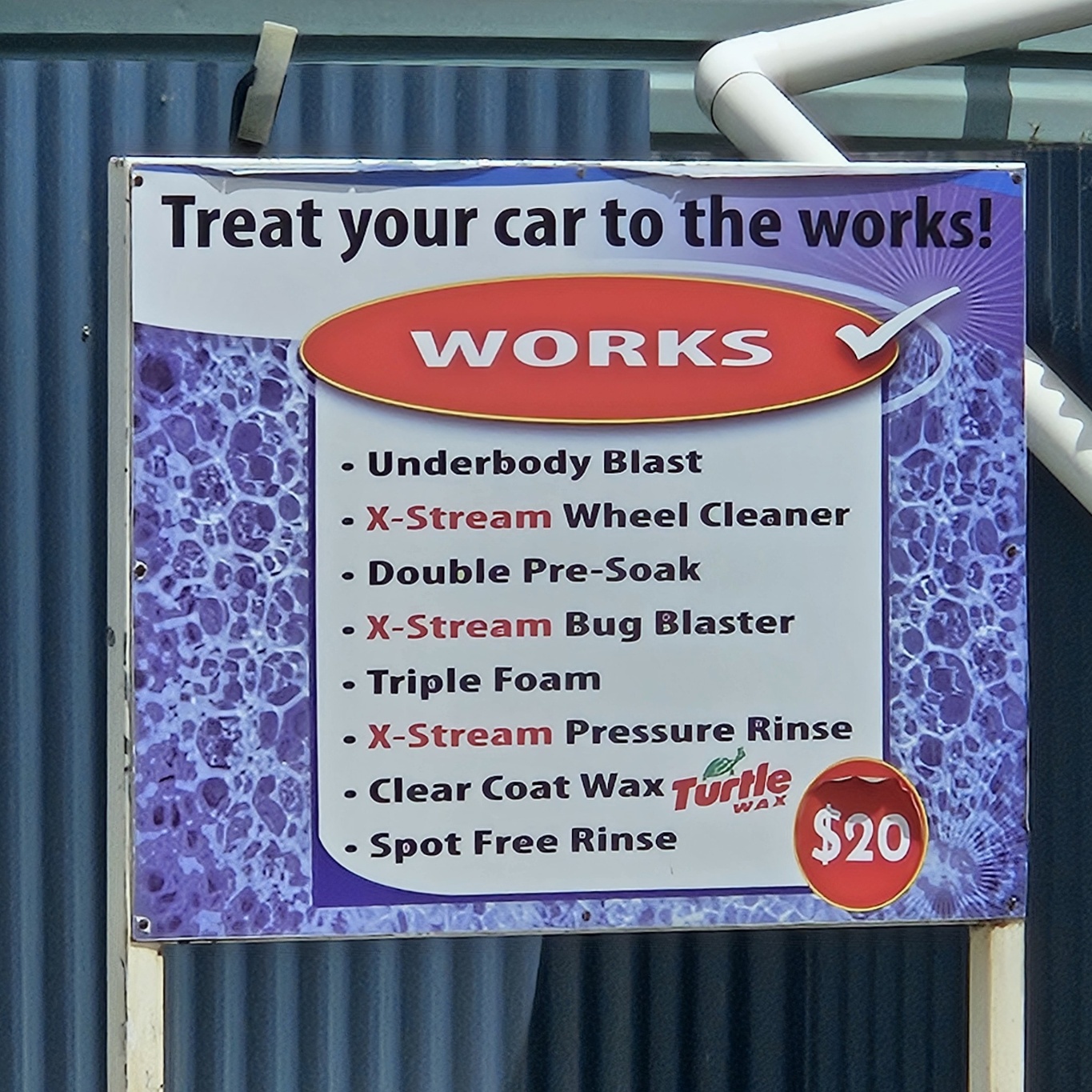 입구로 들어가면 양 옆으로 자동세차장이 있고, 그 사이에 셀프 세차 공간이 있다. 오토 워시는 현금/카드 둘 다 가능한 곳, 카드 결제만 가능한 곳 두 가지. 뭐 익스트림 휠클리너 프리소크 트리플폼 어쩌고 있는데 그냥 자동세차다. 가격은 $20.