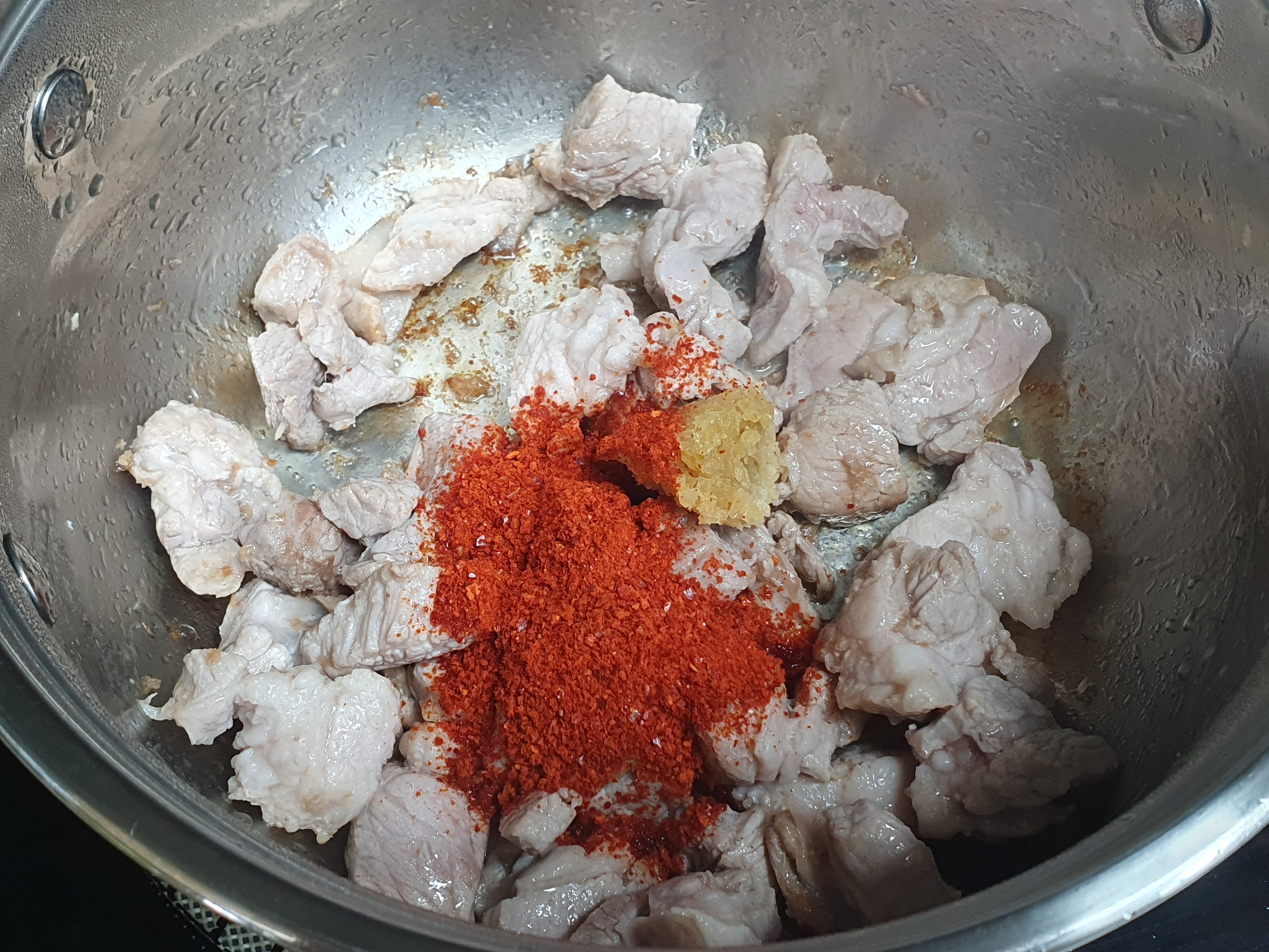 고기 겉면이 노릇하게 익기 시작했다면 고춧가루 2작은술과 다진 마늘 1작은술을 넣어 타지 않게 볶는다. 마늘이 잘 눌어붙으니 불을 줄이고, 고춧가루가 기름에 잘 어우러져서 붉게 올라올때까지 볶는다.