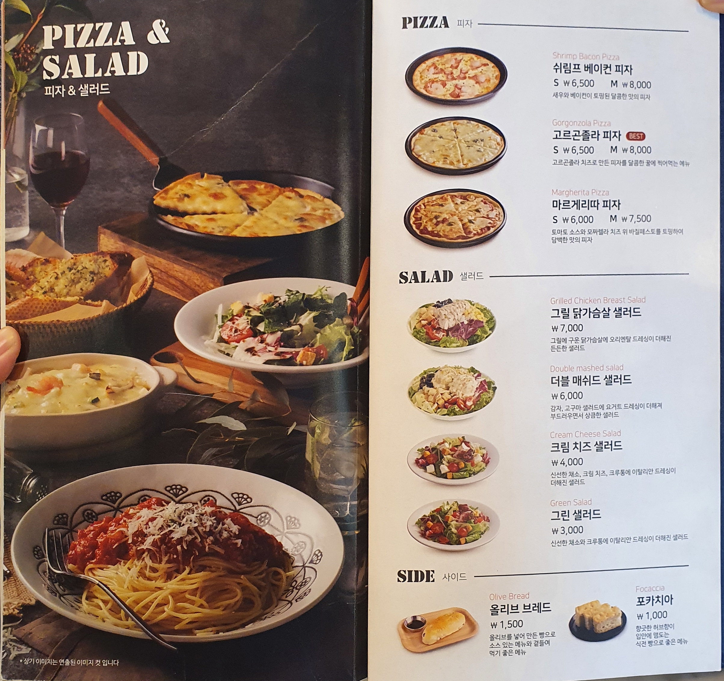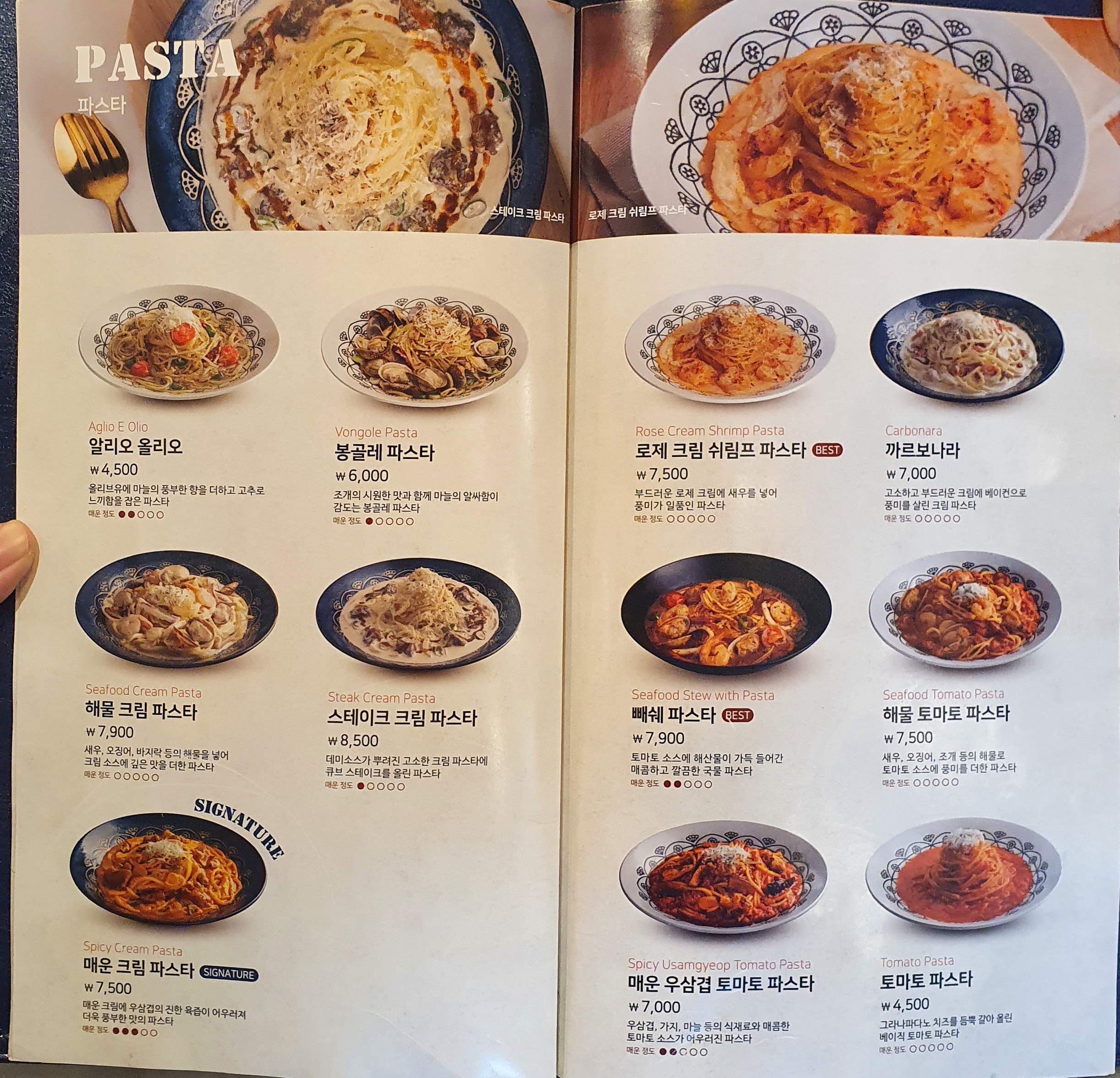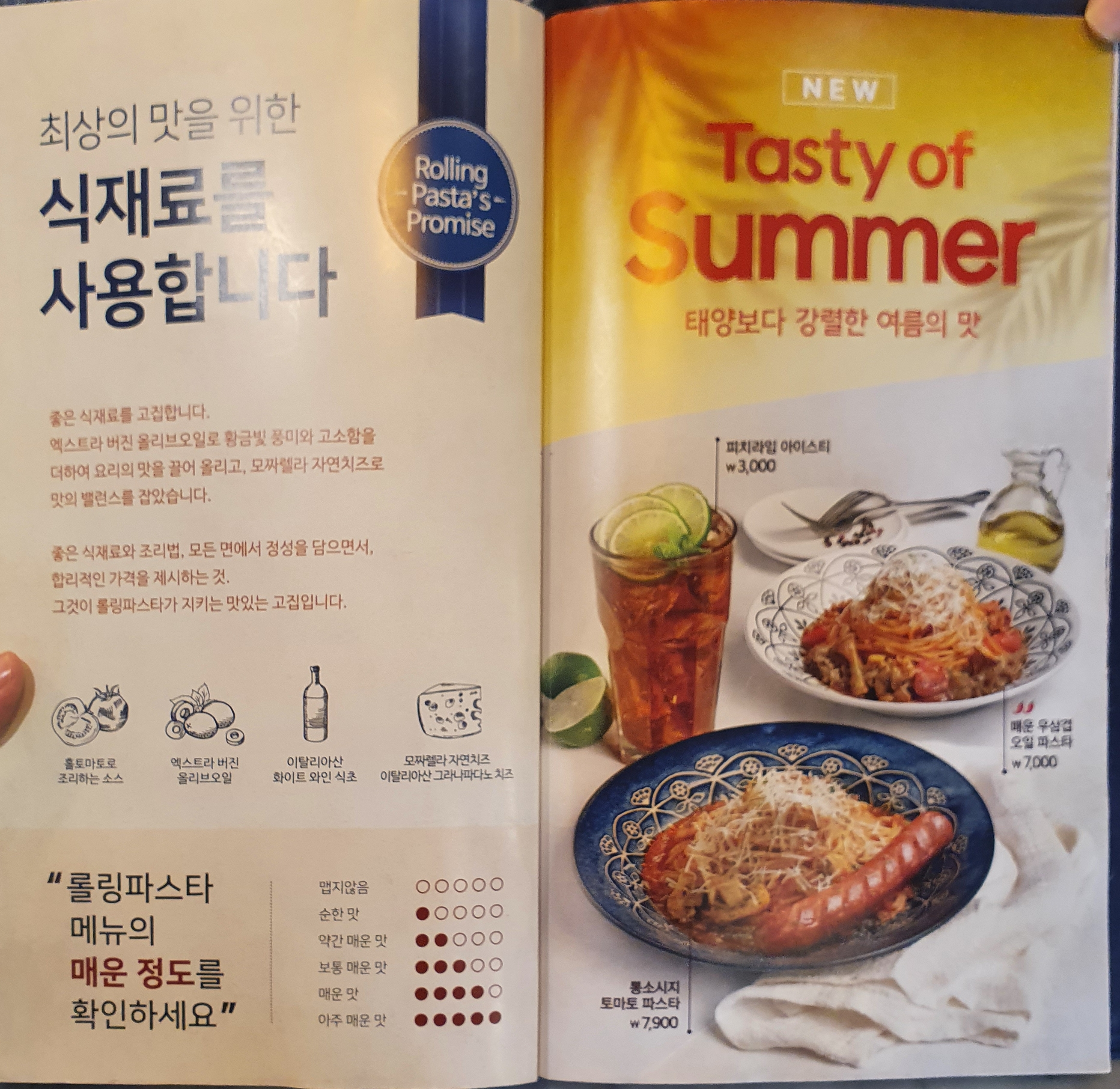 롤링파스타 메뉴판. 뭘 먹을까 하다가 친구가 좋아하는 치즈를 얹은 스타일의 우삼겹 도리아를 하나 주문하고, 시그니쳐라는 매운크림파스타를 주문했다. 치즈오븐스파게티 메뉴가 있으면 좋을 것 같다.