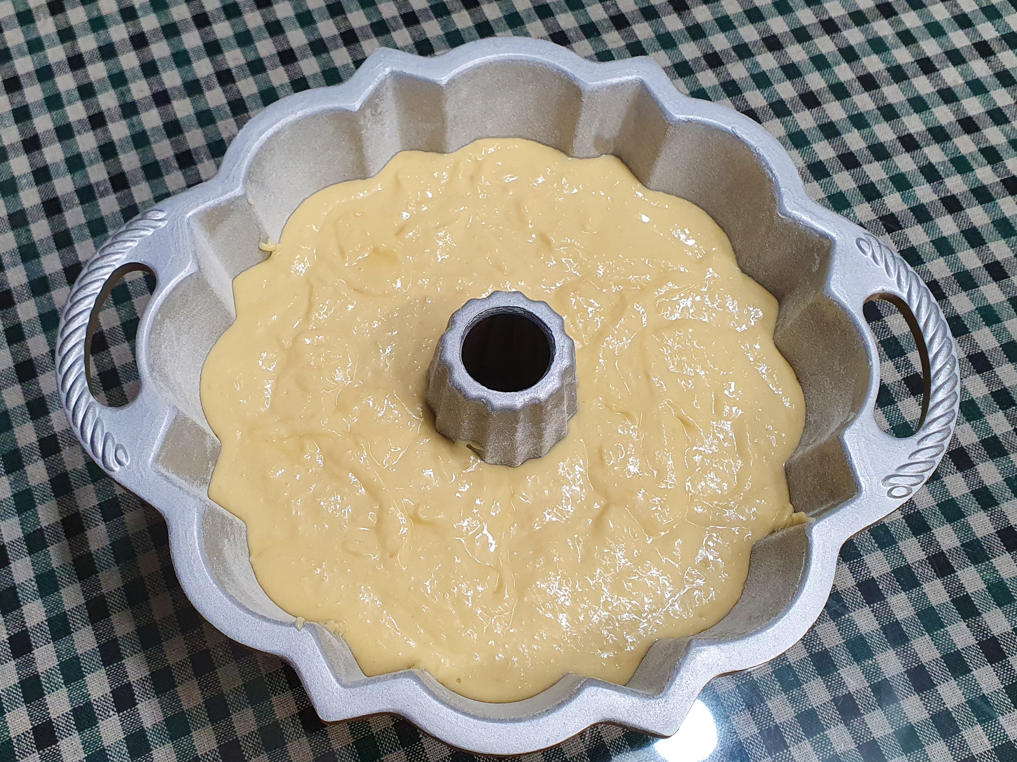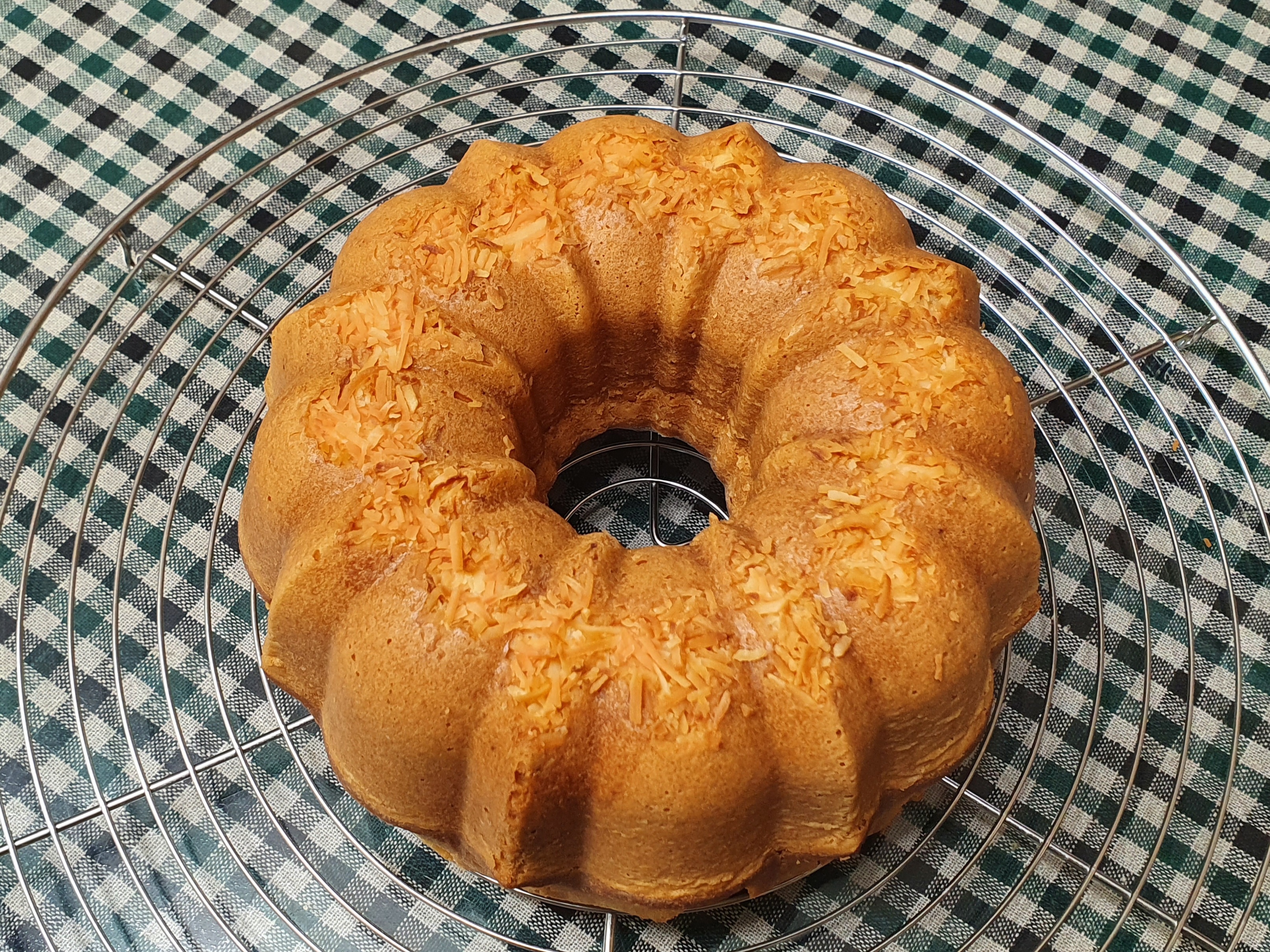 팬에 담았을 때 반죽이 묽은 편이라 팬의 70% 정도밖에 안 찼는데, 다행히 잘 부풀어올라서 빵빵하게 가득 찬 번트케이크가 되었다. 35분째에 꼬치로 찔러서 반죽이 묻어나지 않으면 다 익은 것이니 꺼낸다.